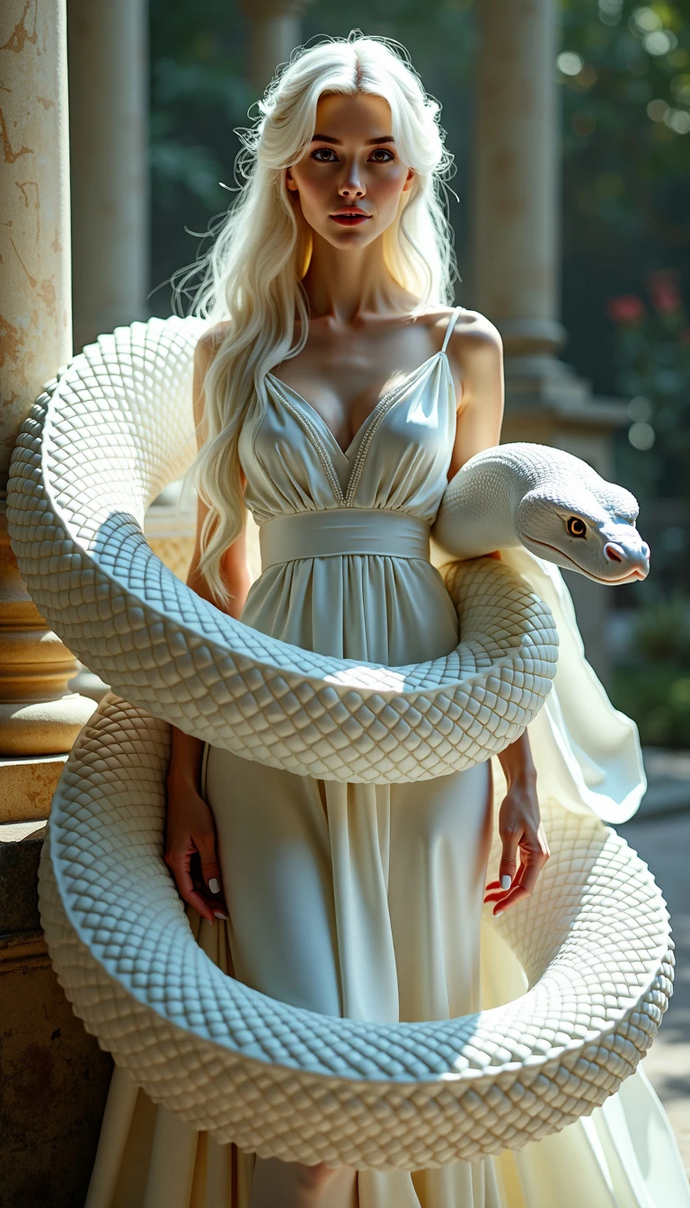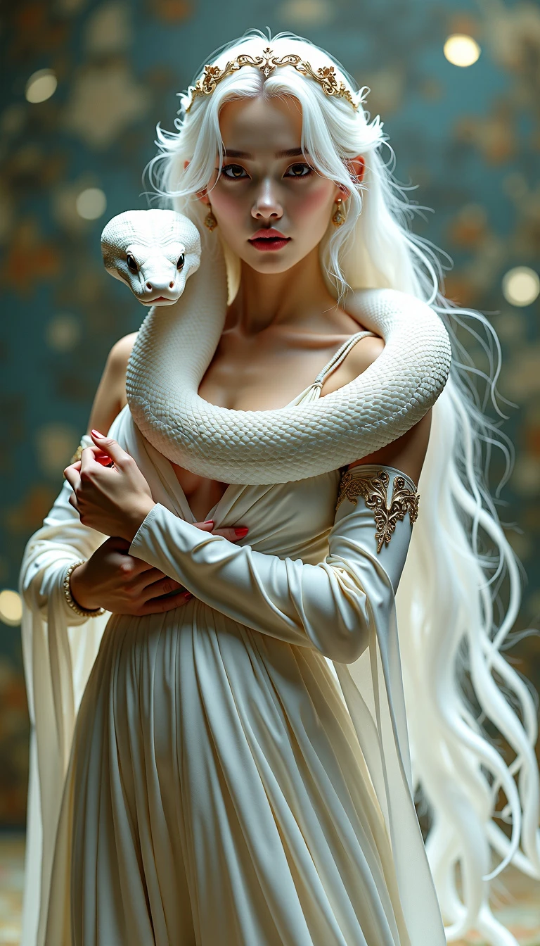 A surreal and hyper-realistic scene featuring a classical beauty dressed in a flowing white silk gown, accompanied by a majestic white snake. The intricate details of her attire and the snake's scales are highlighted, set against a dreamy, ethereal background. The scene is illuminated with soft, magical lighting, enhancing the otherworldly and enchanting atmosphere. surreal, hyper-realistic, classical beauty, white silk gown, majestic white snake, intricate details, dreamy background, ethereal, soft magical lighting, enchanting, otherworldly, visually stunning, high quality, detailed, sharp clarity, breathtaking, elegant, graceful. looking at viewer, long hair, white hair,