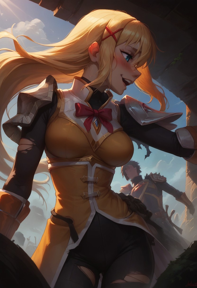 score_9, score_8_up, score_8_up, raw, perky breasts, darkness_\(konosuba\), anatomical position, half lidded eyes, blush, ripped cloths, torn cloths, cowboy shot, battlefield, grey, standing, outdoors, daylight, shade, god rays, smile, open mouth,