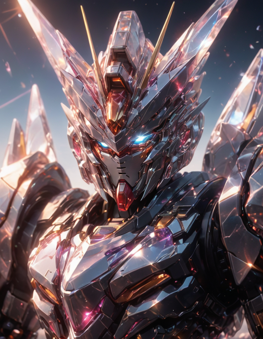 Close-up of Gundam mecha made of crystal, portrait, crystal reflecting colorful sunlight<lora:nijimecha_XL_V7:0.7>,