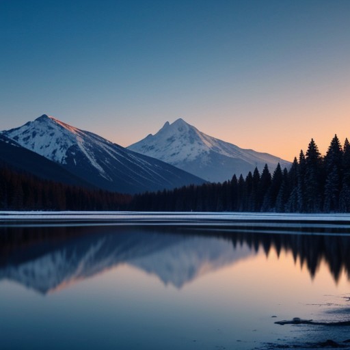 A hand-painted landscape of a serene mountain lake at sunrise, with the calm water reflecting the vibrant colors of the sky and the snow-capped peaks in the background, surrounded by dense pine forests.