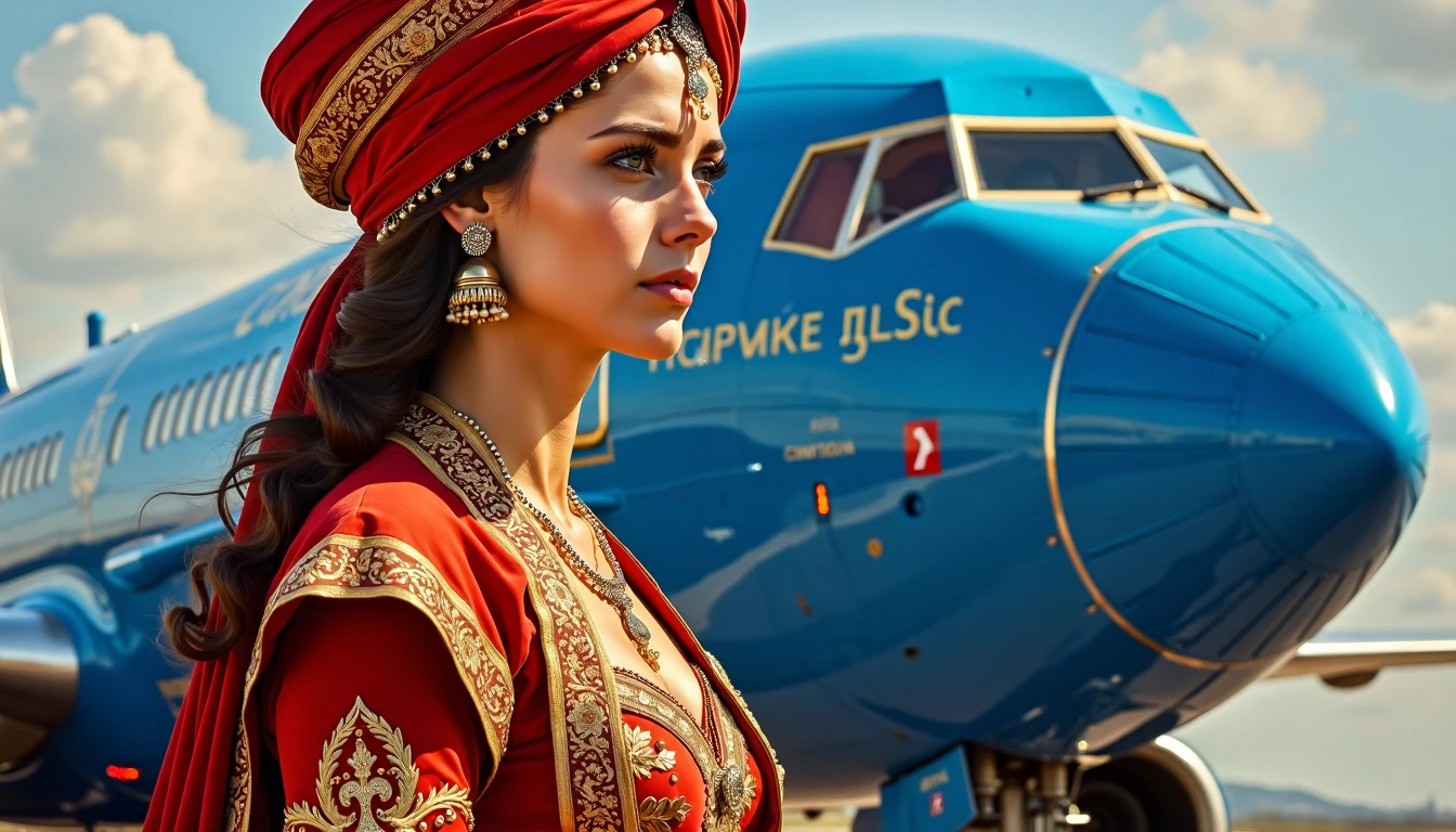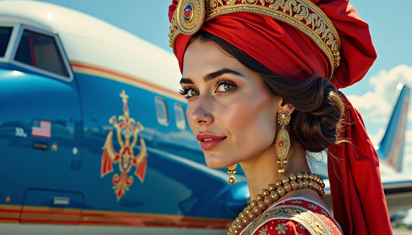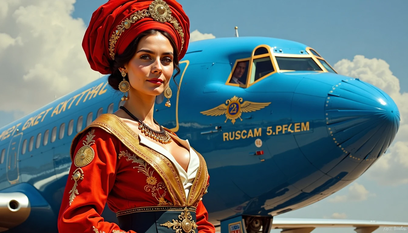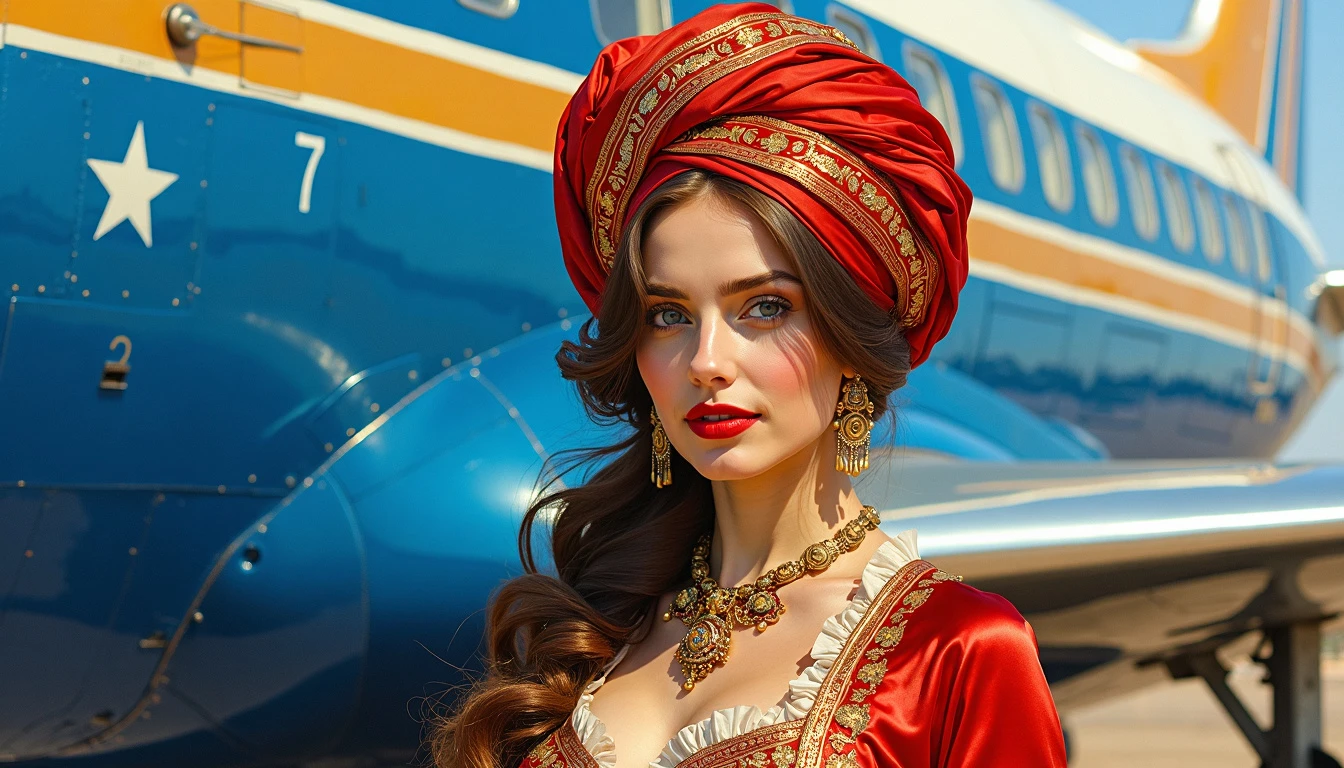A beautiful Russian woman in a red and gold outfit with an ancient turban on her head stands next to a blue plane. The painting is in the style of hyperrealism, with bright colors and high attention to detail.