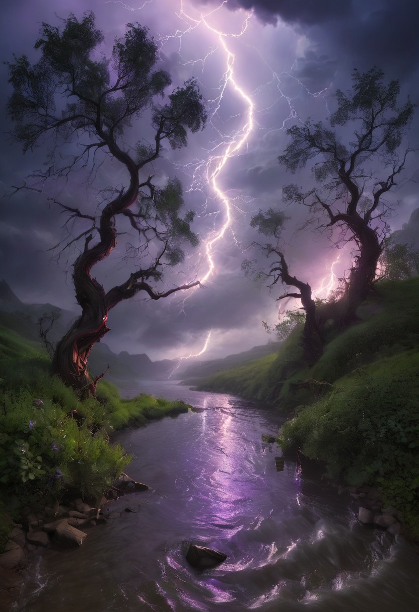 In a breathtaking and otherworldly scene, a mystical landscape is dramatically illuminated by a fierce, electric storm. A rolling meadow, bathed in twilight, stretches beneath a tempestuous sky where jagged bolts of lightning crackle and splay across the darkening canvas. The lightning, vivid and pulsating with electric blues and radiant purples, casts dramatic shadows and highlights across the whimsical terrain. Enchanted trees, with their swirling, luminescent branches, seem to dance in response to the storm’s fury, their foliage shimmering with iridescent colors that mirror the lightning’s intensity. A serene river, previously tranquil, now ripples with kinetic energy as the lightning’s reflection distorts its surface, creating a shimmering tapestry of light and shadow. Fantastical creatures, caught in the storm’s electrifying glow, appear to both shimmer and dissolve into the landscape, their forms momentarily illuminated by each flash. The artwork merges the serene beauty of a dreamlike world with the raw power of nature, capturing a moment of awe-inspiring contrast where peace and chaos coexist in a mesmerizing visual symphony.