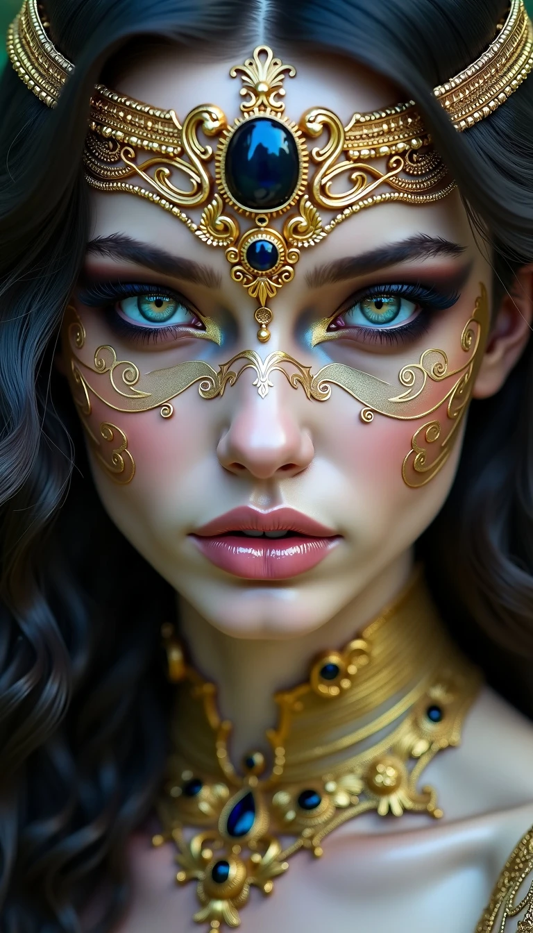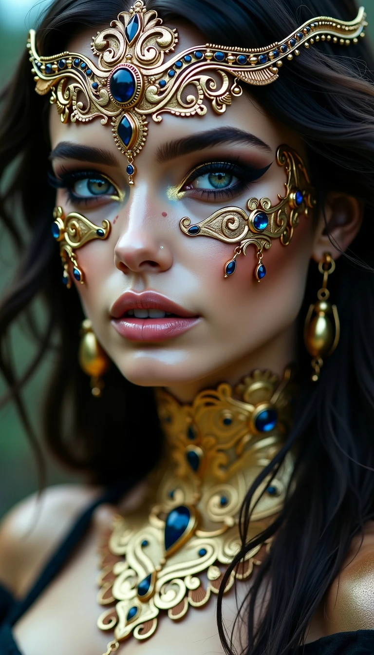 A fantasy portrait of a mysterious woman with elaborate golden face jewelry and intricate patterns adorning her skin. Her eyes are mesmerizing, framed by dark, smoky makeup, creating a dramatic contrast with her porcelain skin. The jewelry features ornate designs with embedded sapphires and fine golden filigree, extending across her face and neck like a delicate mask. Her dark, wavy hair cascades around her, adding a sense of depth and texture. The lighting is soft yet highlights the metallic details, evoking a sense of otherworldly elegance and ethereal beauty --v 6.1