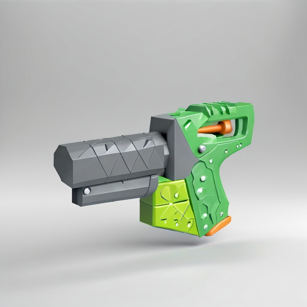 3d gun, render, funny, paintball, paintballgun, less polygonal, square and triangular design, round type, angular design, toy-like, triangular surfaces, square parts, cylinder barrel, wide, fewer parts,