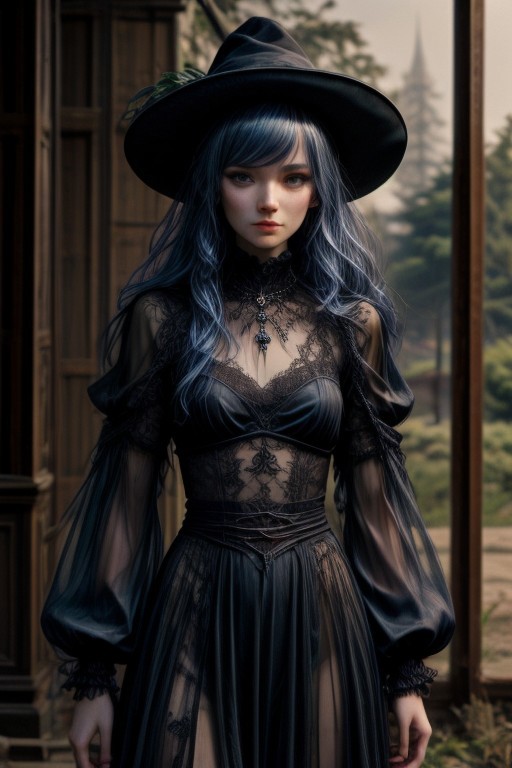 (masterpiece:1.2), (best quality,:1.2), 8k, HDR, ultra detailed, ((photorealistic)), cinematic lighting, high depth-of-field, Lord of the Ring, dark fantasy, <lora:weight_slider-LECO-v1:-5> BREAK slender mature woman, witch, posing, flirty smile, BREAK translucent tattered gown, pointy hat, standing in front of goats, BREAK (cornflower blue hair), (blue eyes), BREAK (narrow hips, flat chest, slim waist), BREAK slim face:1.5, perfect face, perfect hands, eye contact, realistic face, realistic eyes, pale skin, narrow hips, BREAK background sunset over forest clearing