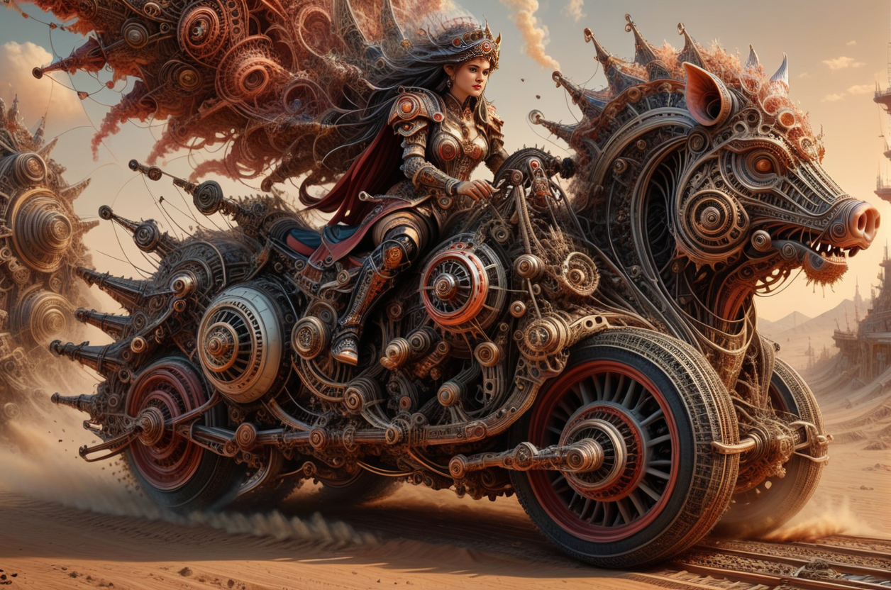 (steampunk war machine with pig head blasting through the desert raising a trail of dust), (single female human warrior sitting on top of machine on a saddle, hands on handlebar), (mechanical, pipes, steam, pistons, engine, wires, spiked tyres, cannons, ral-frctlgmtry, g0ldl34f), (red sky), (high contrast), (steampunk illustration) <lora:ral-frctlgmtry:1> <lora:g0ldl34fXLP:0.2> <lora:detailed_notrigger:1>