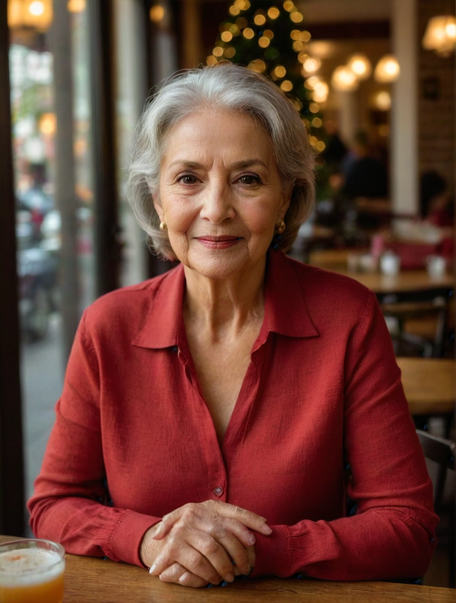 Raw photo of a woman, 70yo, caucasian, sitting inside a restaurant, wearing a red casual outfit, rim lighting, studio lighting, looking at the camera, ultra quality, sharp focus, dof, film grain, Fujifilm XT3, crystal clear, 8K UHD, highly detailed glossy eyes, high detailed skin, christmas, large windows, smile, hispanic, latin, mexican, shot with leica, <lora:add-detail-xl:1><lora:PerfectEyesXL:1> brown eyes, perfecteyes