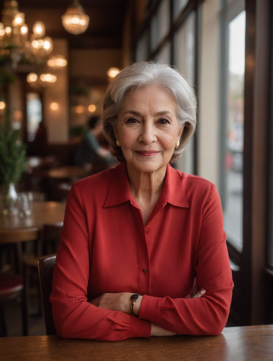 Raw photo of a woman, 70yo, caucasian, sitting inside a restaurant, wearing a red casual outfit, rim lighting, studio lighting, looking at the camera, ultra quality, sharp focus, dof, film grain, Fujifilm XT3, crystal clear, 8K UHD, highly detailed glossy eyes, high detailed skin, christmas, large windows, smile, hispanic, latin, mexican, shot with leica, <lora:add-detail-xl:1><lora:PerfectEyesXL:1> brown eyes, perfecteyes