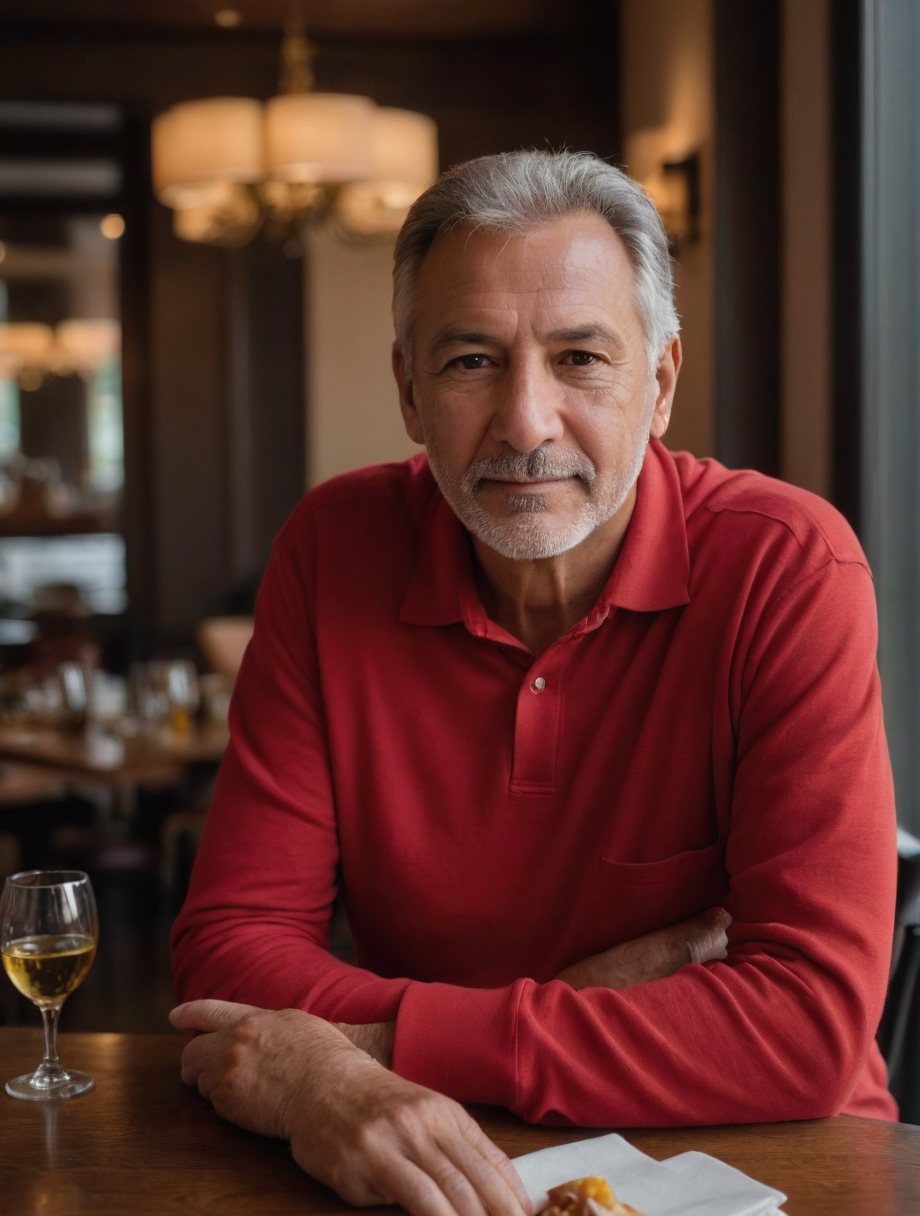 Raw photo of a man, 60yo, caucasian, sitting inside a restaurant, wearing a red casual outfit, rim lighting, studio lighting, looking at the camera, ultra quality, sharp focus, dof, film grain, Fujifilm XT3, crystal clear, 8K UHD, highly detailed glossy eyes, high detailed skin, christmas, large windows, smile, hispanic, latin, mexican, shot with leica, <lora:add-detail-xl:1><lora:PerfectEyesXL:1> brown eyes, perfecteyes