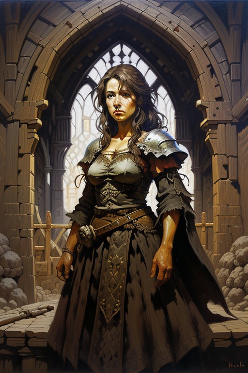 Dungeons and Dragons character, adventurer, female wizard, Half-timbered Construction, oil painting,