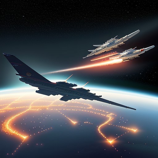 two large capital ships in space, background stars, rocket ship space battle, firing prety lights at each other, coruscating brilliant colored lights, dazzling display of colorful lights