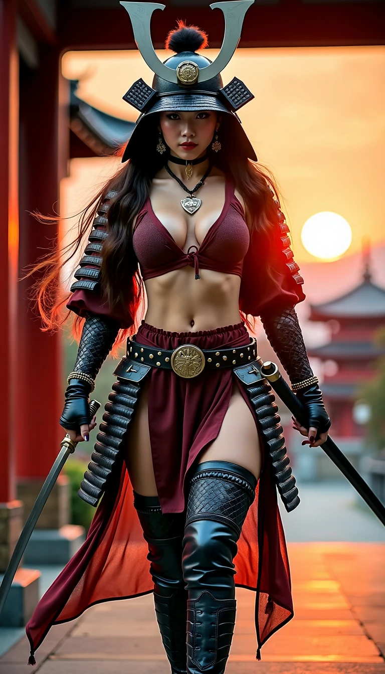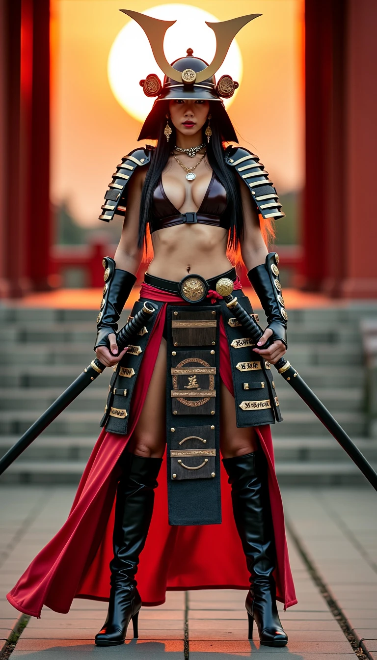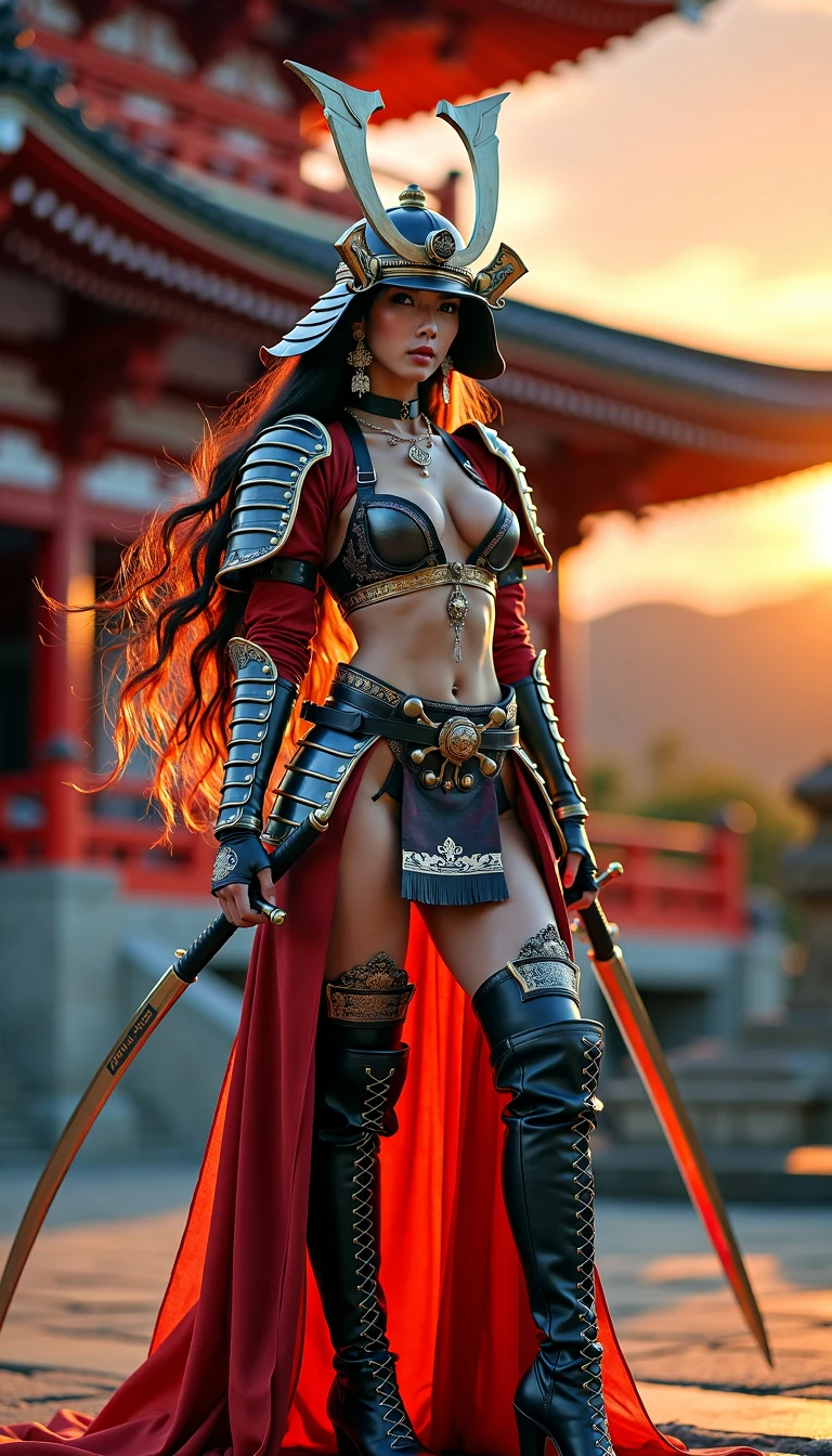 stunnning oriental female samurai, naked , long hair, samurai helmet, holding katana with both hands, dynamic stance, erotic, , shoulder armour, thigh-high high-heeled boots, earrings, necklaces, masterpiece, standing in front of eastern shinto temple, sunset, photography