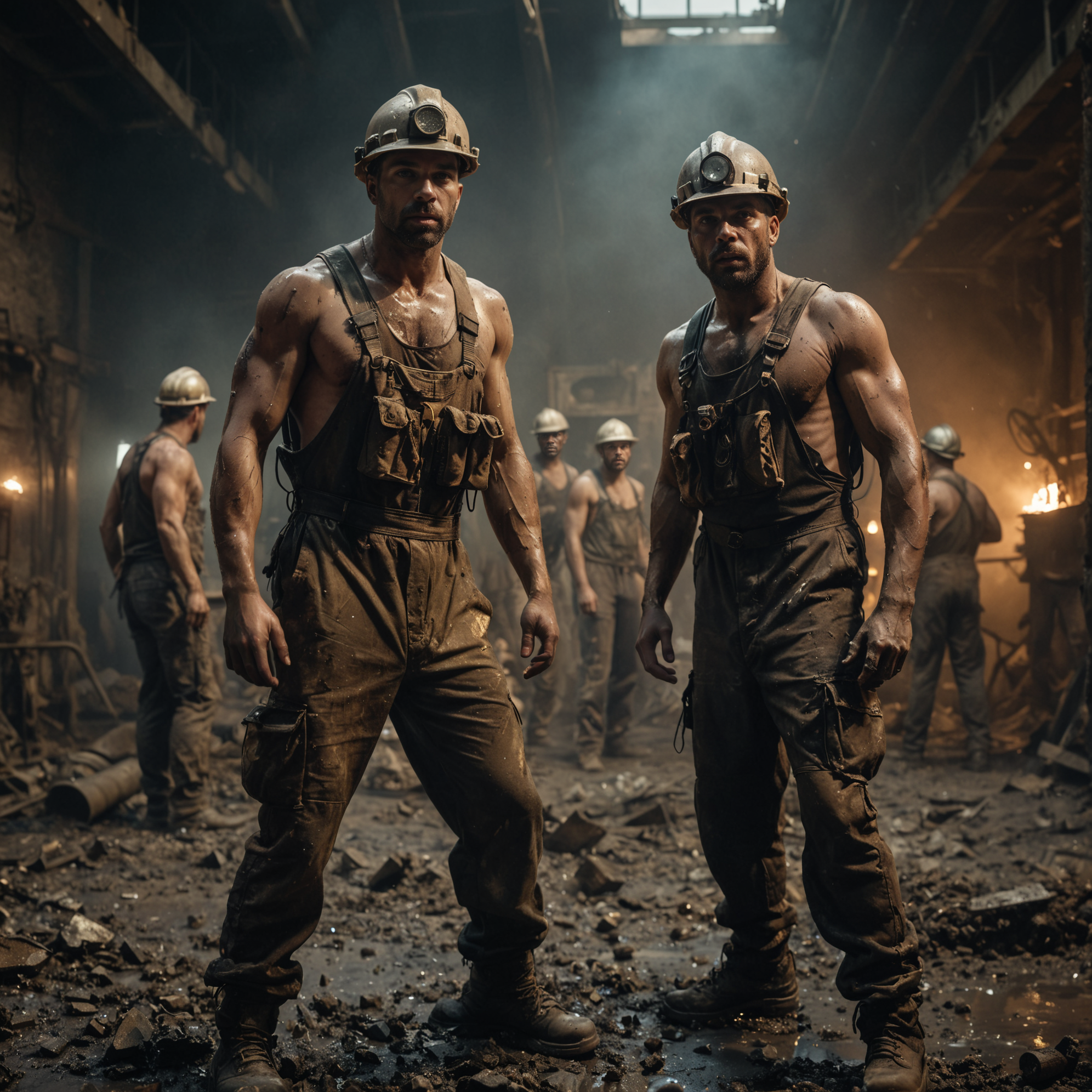 miners,voguing,apocalyptic background,studio photography,reflections,cinematic shot,incredibly detailed,sharpen,hyper details,pale gradient colour palette,professional lighting, (((masterpiece))),(((best quality))),(((high quality))),