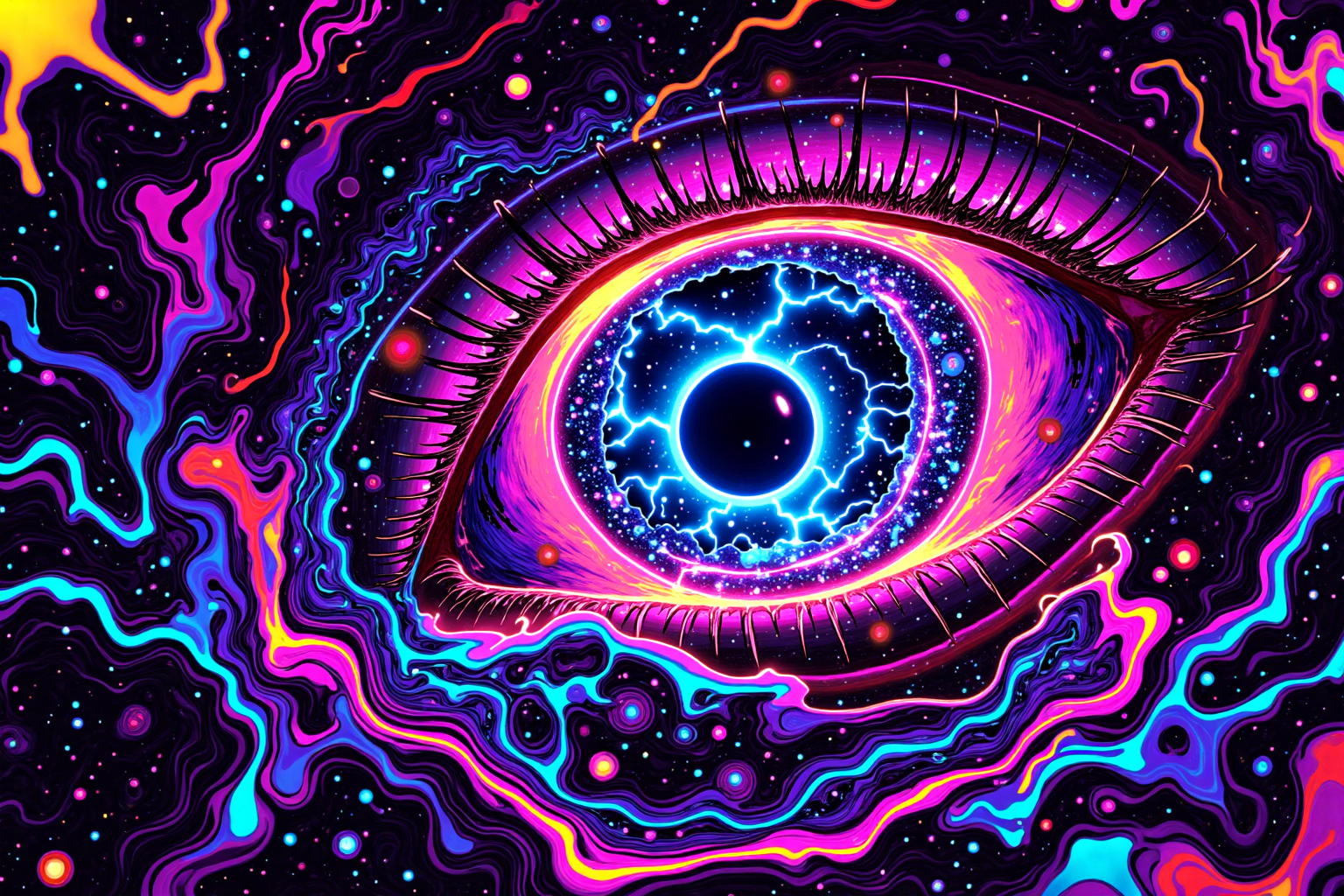 bmstlyle Abstract, vaporwave, a (godlike being:1.8) composed entirely of neon lights and digital static, its form glitching in and out of reality, shifting between humanoid and alien, (liquid crystal skin:2.0) reflecting a kaleidoscope of impossible hues, (eyes that are black holes:2.1), (holographic veins:1.7) pulsating with digital data streams, (fingers trailing afterimages:1.9) that leave reality warped and twisted in their wake, floating in a (void of pure static:2.4), surrounded by ghostly echoes of forgotten memories, the air thick with the scent of burnt ozone and electricity, a walking (aneurysm of color:2.3) and form, terrifyingly beautiful, unreal, a (digital deity of the neon cosmos:2.5).