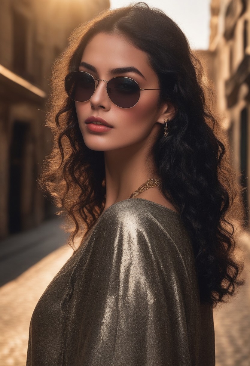 score_9, score_8_up, score_7_up, score_6_up, BREAK 1girl, (Latina, shiny black hair, curly wavy hair, wet hair, tan skin, high cheekbones, headshot), green eyes, smirk, sun shining in background, sunglasses, (details in in Ultra HD quality), jewelry, gold necklace, gold earrings, looking at viewer, dynamic angle, detailed background, dramatic lighting