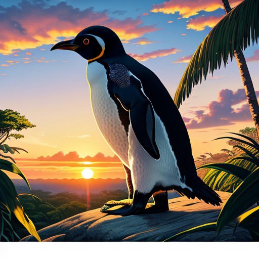 a big ferocious black penguin , jungle, sunset, illustration in the style of ASstyle001