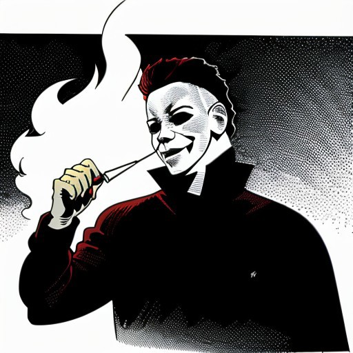 Michael Myers smoking a joint, smoke from his eyes and ears , very bright cartoon smile, laughing. god rays, highly detailed, high res, high budget, bokeh, popart, Cinemascope, moody, epic, mchlmyers, jointz,
