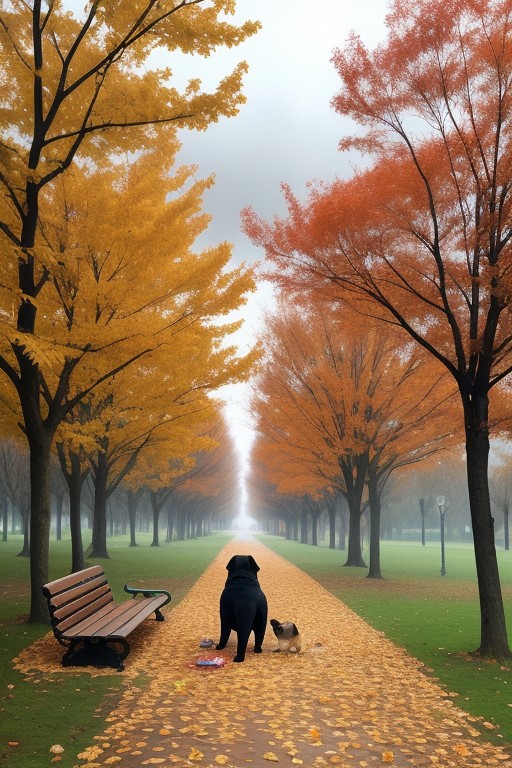 score_9, score_8_up, score_7_up, masterpiece, ultra detailed, best quality, 1dog, pug, empty park, overcast sky, autumn leaves, dog wandering among the fallen leaves, eyes searching and sad, fur a bit matted, scattered toys and benches, a sense of nostalgia and loss, subdued lighting, emotional and contemplative mood.