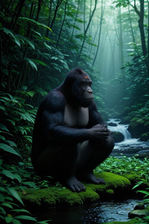 Create a realistic image of a powerful, silverback gorilla sitting in a dense jungle. The gorilla has a strong, muscular build with dark fur and silver streaks running down its back. It sits calmly, gazing into the distance with a wise expression in its deep brown eyes. The jungle around it is lush, with towering trees, thick vines, and patches of sunlight filtering through the canopy. Nearby, tropical birds and vibrant flowers add splashes of color to the scene, while a river flows gently in the background, reflecting the greenery of the forest.