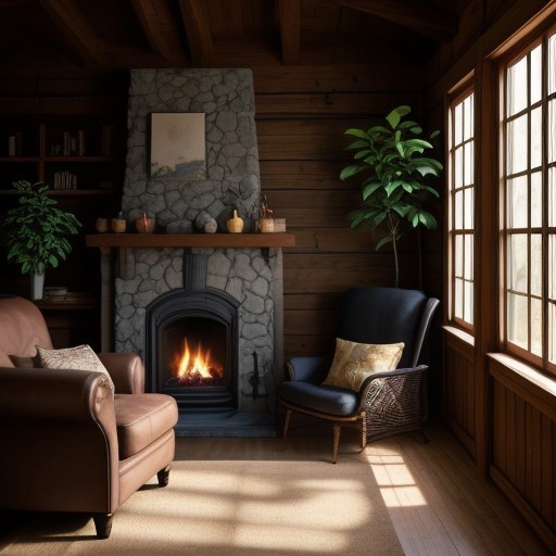 Generate a cozy, rustic cabin interior scene in the middle of a forest during autumn. The cabin features wooden walls and large windows showing the vibrant colors of red, orange, and yellow leaves outside. Inside, a stone fireplace crackles with a warm fire, and a large, plush armchair sits nearby, draped with a wool blanket. A steaming cup of tea rests on a wooden table beside the chair. The soft glow of evening light filters in, creating a peaceful, inviting atmosphere. Shelves filled with books and plants line the walls, adding to the charm and comfort