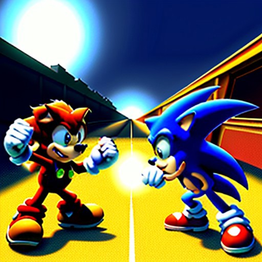 Super Mario and Sonic the Hedgehog fist fighting, health bars, flat lighting, low resolution, epic win, <lora:N64_Game_Style_F1DFULL:1.4>