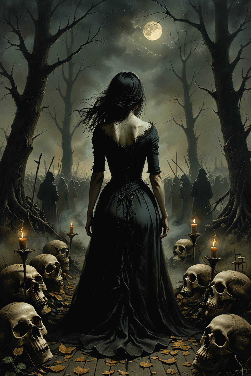 Anything is what she is Anywhere is where she's from Anything is what she'll be Anything as long as it's mine And the door it opens is the way back in Or is it the way back out? Anyplace is where she'll be Anyplace, she'll see you from Lies and secrets become your world Anytime, anywhere she takes me away And death climbs up the steps one by one To give you the rose that's been burnt by her son Point me to the sky above I can't get there on my own Walk me to the graveyard Dig up her bones I have seen the demon's face I have heard of her death place I fall down on my knees in praise of the Horrible things that took her away Bones graveyard, outdoors, dramatic night, (best quality, masterpiece:1.2), absurdes, concept art, surreal, gothic, dark fantasy, Realism, renaissance, dramatic, tragic, thrilling, <lora:Surreal Harmony:0.5> Surreal Harmony <lora:tbh118-sdxl:0.5> style of Anton Semenov <lora:Dark_Novel:0.4> Francisco Goya, Jason Benjamin
