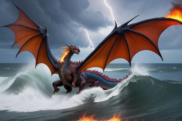 score_9, score_8_up, score_7_up, score_6_up, masterpiece, best quality, ultra detail, (giant dragon:1.5), enormous wings, (sharp, scaly body), long tail, (intense glowing eyes), (detailed face), powerful claws, ferocious, dominating, flying over the ocean, (breathing fire), (fiery breath lighting up the sky), flames erupting from mouth, (burning embers in the air), dark stormy sky, (huge crashing waves), (lightning strikes), heavy rain, strong wind, dragon wings causing massive sea ripples, (focus on dragon), (ocean and sky as background), creating a sense of scale and power, (majestic, fearsome, and fiery)