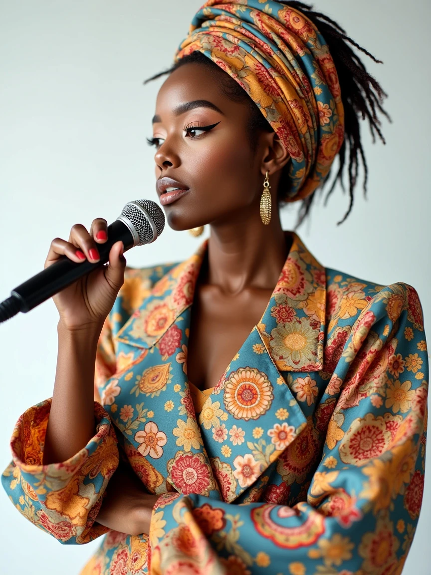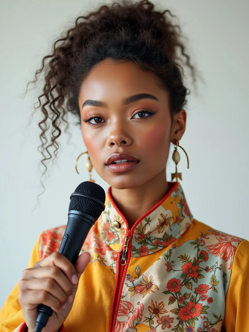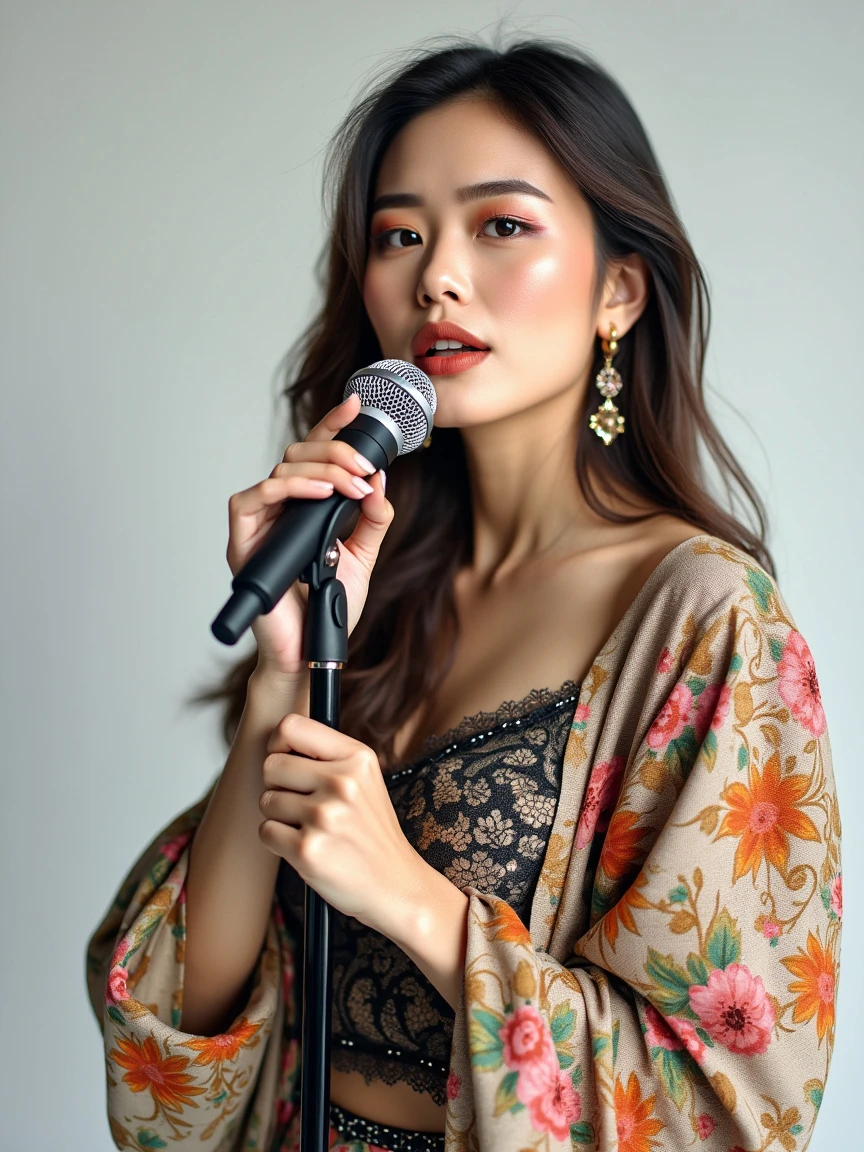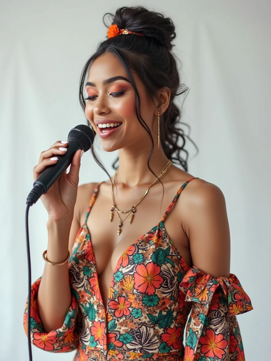 A beautiful woman, elegant, gentle, with textured skin, wearing colorful fashionable clothes, exquisite facial features, delicate makeup, meticulously crafted, holding a microphone singing, full body photo, panoramic view, high resolution, pure white background, professional photography, very detailed, lifelike, 8k