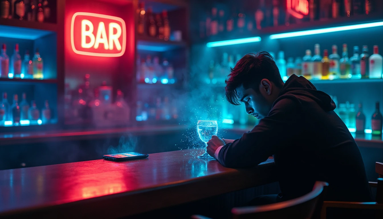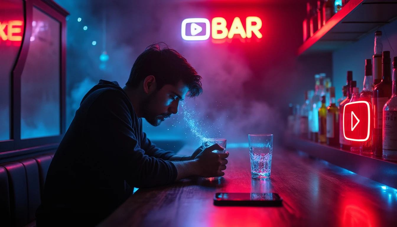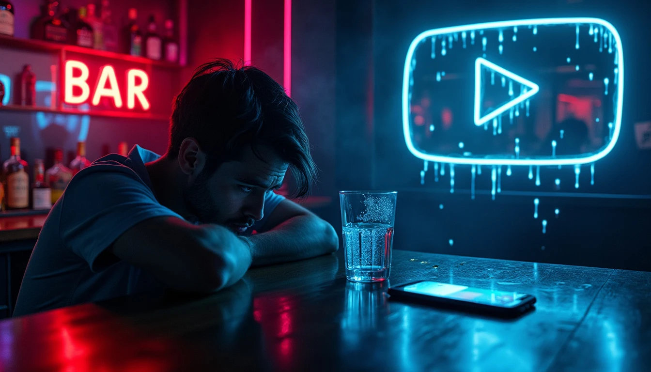 A lone figure sits at the bar, leaning over a half-empty glass. His face is partially hidden, but visible tears are streaming from his eyes, glowing with neon reflections. The person's posture conveys defeat and despair, with his shoulders slumped and his hands shaking as he holds the glass. The bar: A dark, empty bar, lit primarily by neon lights. The bar is made of dark, polished wood, reflecting the neon lights and the tears falling onto it. Bottles of liquor line the shelves behind the bar, each emitting a soft neon glow of a different color. Neon effects: The bar is lit by neon tubes in blue, red, and purple, creating dramatic shadows and reflections on the surface of the bar. The person's tears glow with a light blue neon effect as they fall, creating small splashes of light as they hit the bar. A red neon "BAR" sign flashes intermittently in the background, half-dimmed, symbolizing flickering hope. YouTube Logo: The YouTube logo floats prominently next to the person, like a 3D hologram. The logo glows brightly in neon white, contrasting with the darker colors of the surroundings. Small lines of code or neon pixels drip from the logo, as if it is materializing or dissolving. Additional Details: A smartphone in front of the person displays a paused YouTube playback screen, with a frozen image of a motivational video. Distorted reflections of the neon lights on the bottles and mirrors of the bar create abstract and surreal patterns. A fine mist hangs in the air, catching and diffusing the neon lights, adding depth to the scene. Composition: The person occupies the center-left of the image, with the YouTube logo floating prominently to the right. The angle of the scene is slightly elevated, looking down toward the bar, emphasizing the loneliness and vulnerability of the person. Overall Atmosphere: The scene conveys a sense of isolation and sadness, despite the vibrant colors of the neon. The contrast between the neon glow and the darkness of the bar creates a surreal and emotionally charged atmosphere. There is an almost cinematic quality to the image, as if it were a still from a futuristic film noir."