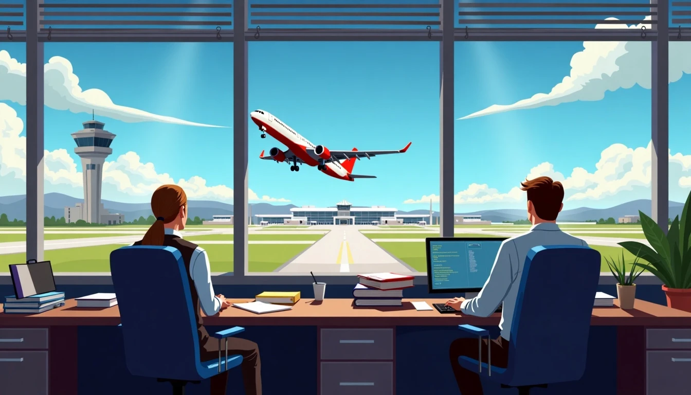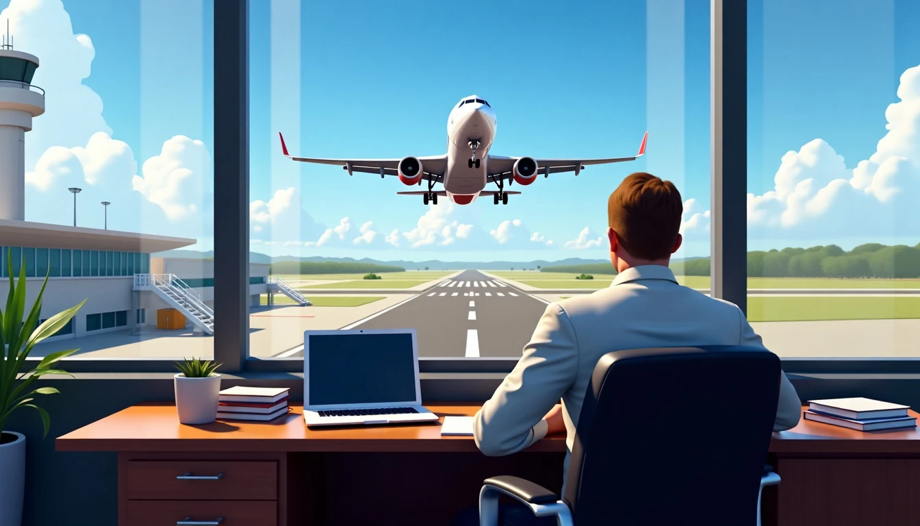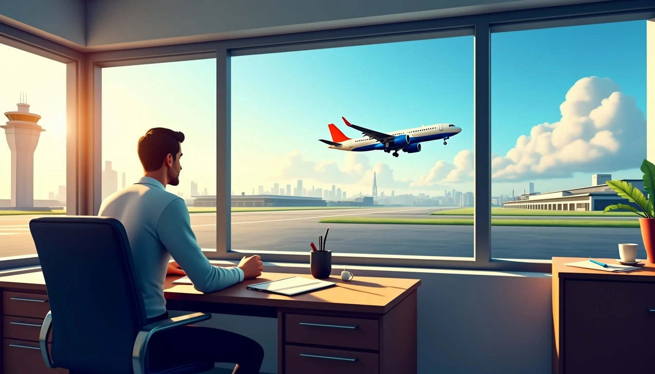a cover image for a tycoon/management airport game. The image has a realistic computer graphics style. The scene is set in an airline manager's office. He's sitting down in a desk, turned away from the camera, looking through the window. Outside the window, there's a runway, a control tower, a clear blue sky and a beautiful commercial imposing plane taking off.