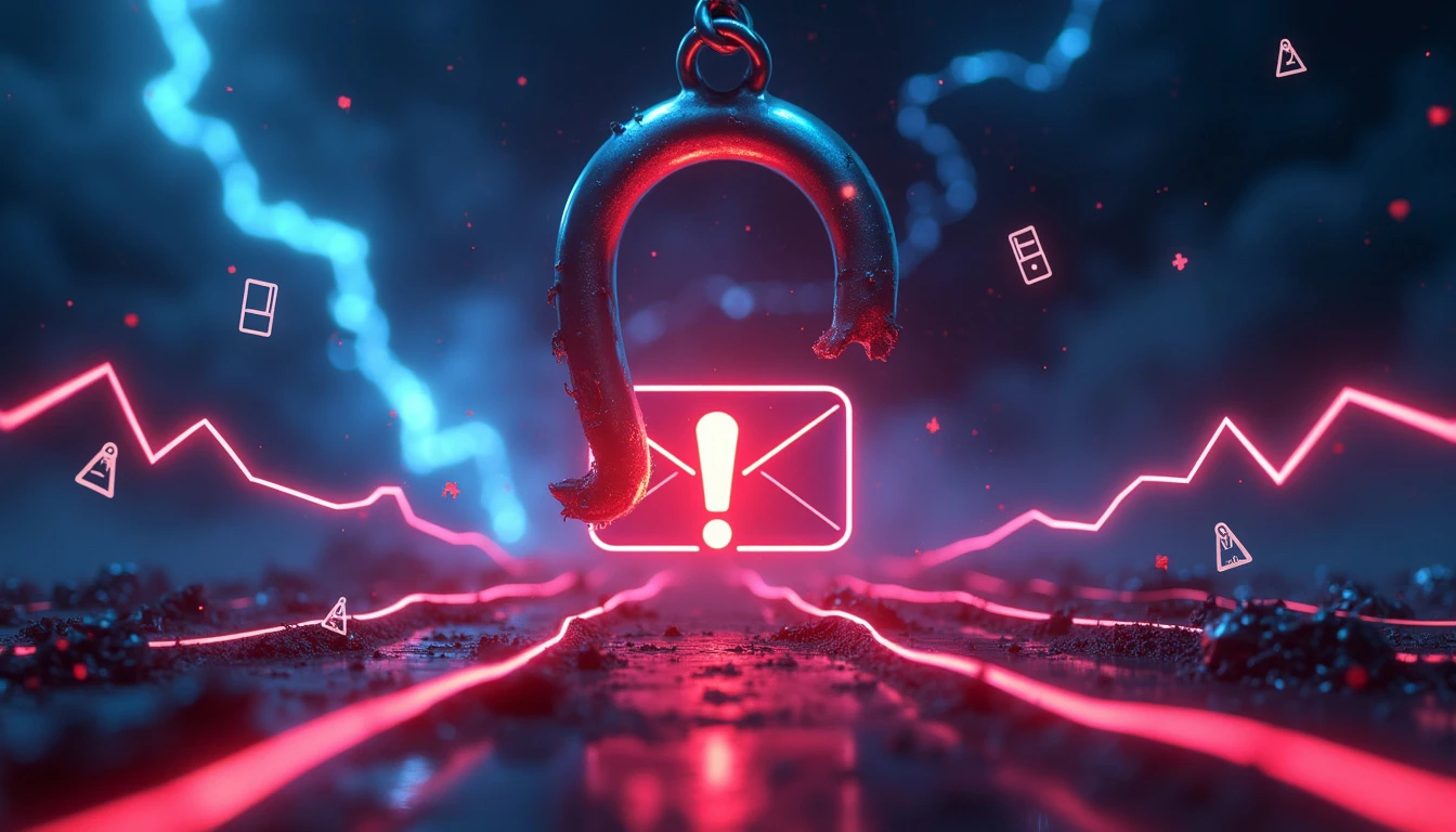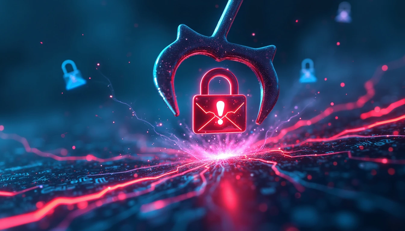 Main Visual: Phishing Hook: A large, menacing hook made of metallic, jagged edges with a glowing neon blue outline. The hook is descending from the top of the image, aiming towards a stylized email icon with a bright red exclamation mark in the center. Background: Digital Storm: The background should feature a dark, stormy digital landscape with swirling binary code (1s and 0s) and glitch effects. Include lightning-like streaks of neon colors (blue, purple) to create a sense of urgency and danger. Supporting Elements: Cyber Threat Icons: Scatter small icons of broken locks, warning triangles, and virus symbols around the hook to emphasize the dangers of phishing. Targeted Devices: Show faint silhouettes of devices like a smartphone and a computer screen on the sides of the image, with red lines connecting them to the phishing hook, symbolizing how they are being targeted. Dynamic Effects: Movement Blur: Add a slight blur effect to the hook and background to convey motion, as if the hook is rapidly descending towards its target. Glowing Trails: Include glowing trails behind the hook to make it appear as though it’s slicing through the digital storm, creating a path of destruction. Pulsating Light: Surround the email icon with pulsating red and white light, making it the focal point of the image and drawing the viewer’s attention immediately. This image should be eye-catching and convey the urgency and danger associated with phishing attacks in a visually impactful way.