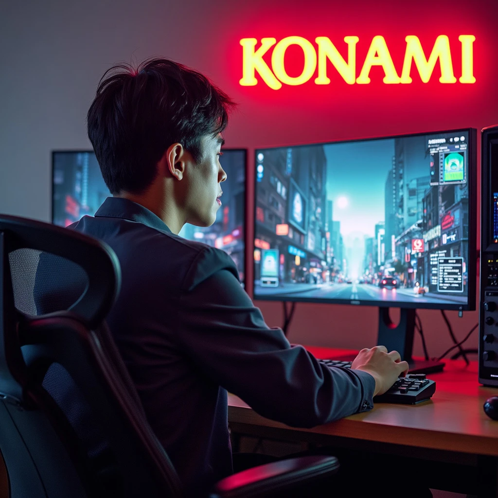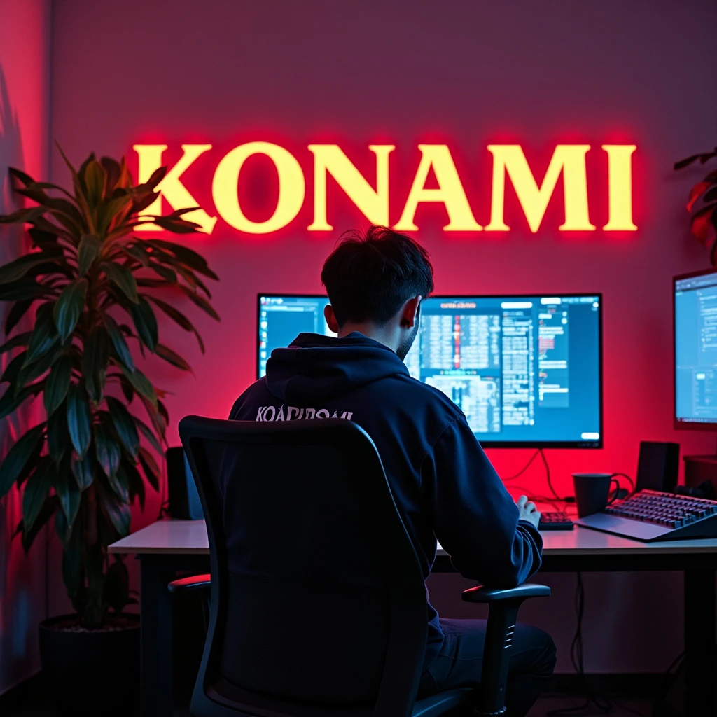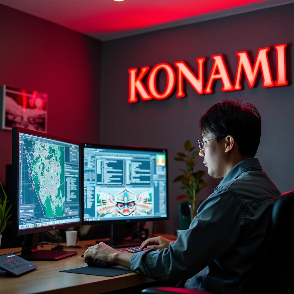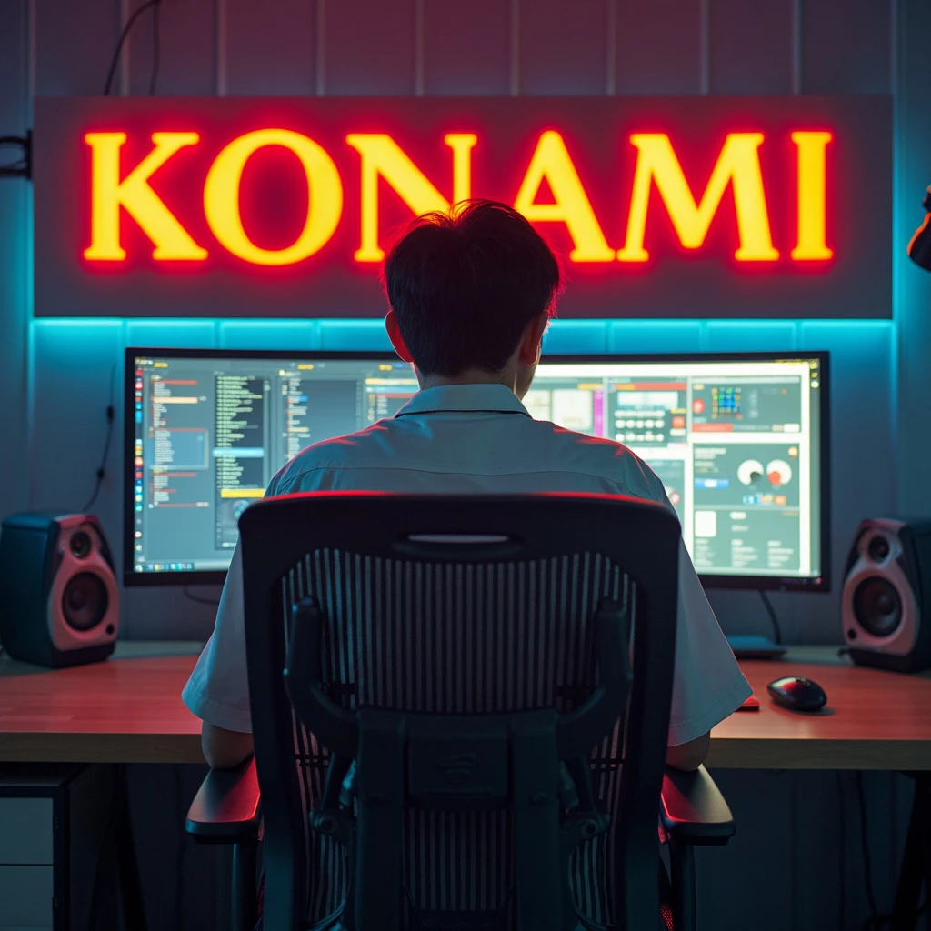 A Japanese game developer in front of him is a large computer and on the wall it says konami in red