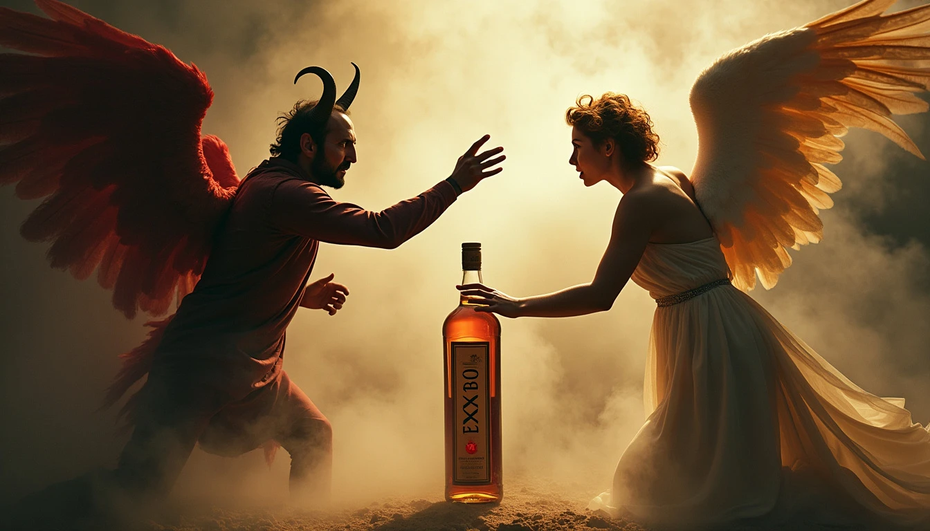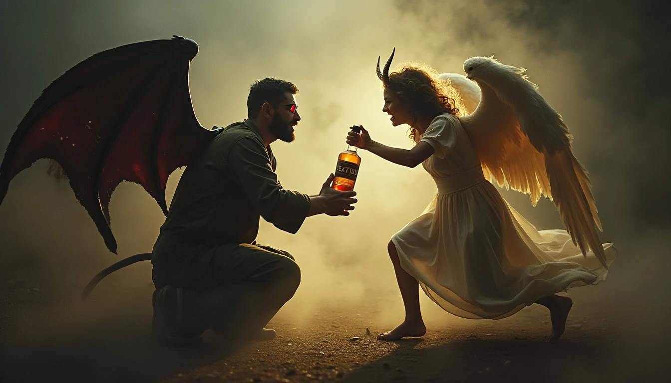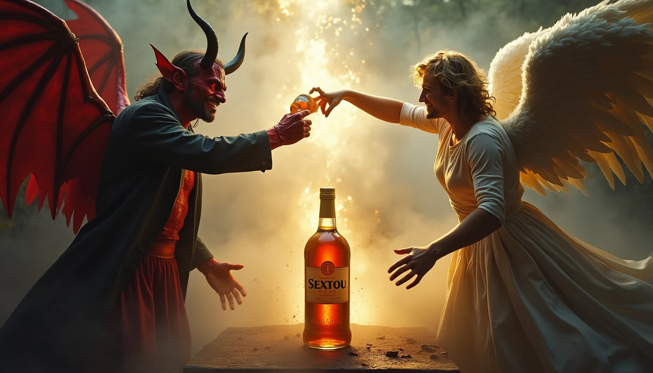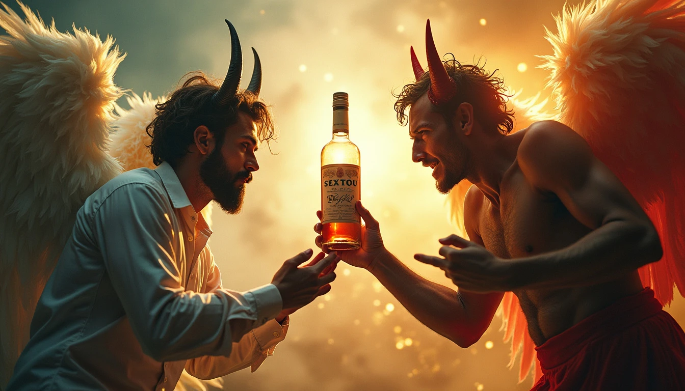 The image depicts a symbolic and intense scene. In the center, a person is being pulled in opposite directions: on one side, the Devil with red eyes and dark features tries to hand him a bottle of alcohol. On the other side, an angel with large, lush wings, with a soft golden light surrounding him, tries to protect and prevent the person from taking the bottle. In the middle, a bottle of alcohol, highlighted with the word "SEXTOU", represents the temptation to relax and escape. The atmosphere is one of contrast between light and darkness, reflecting the struggle between giving in and resisting temptation.