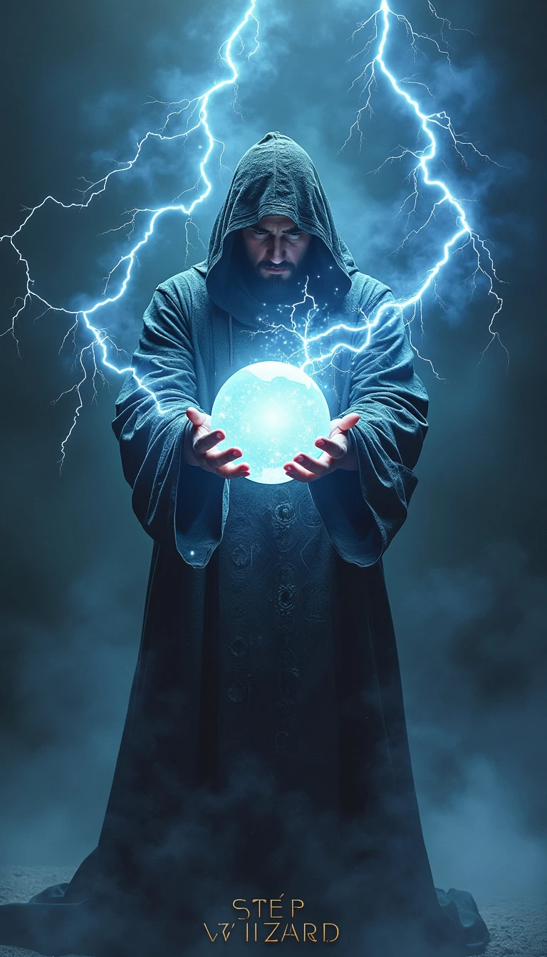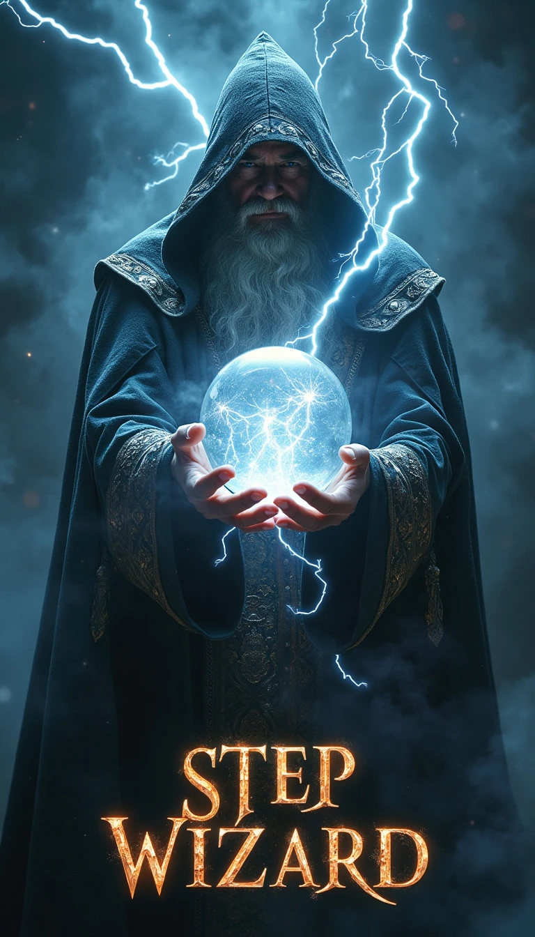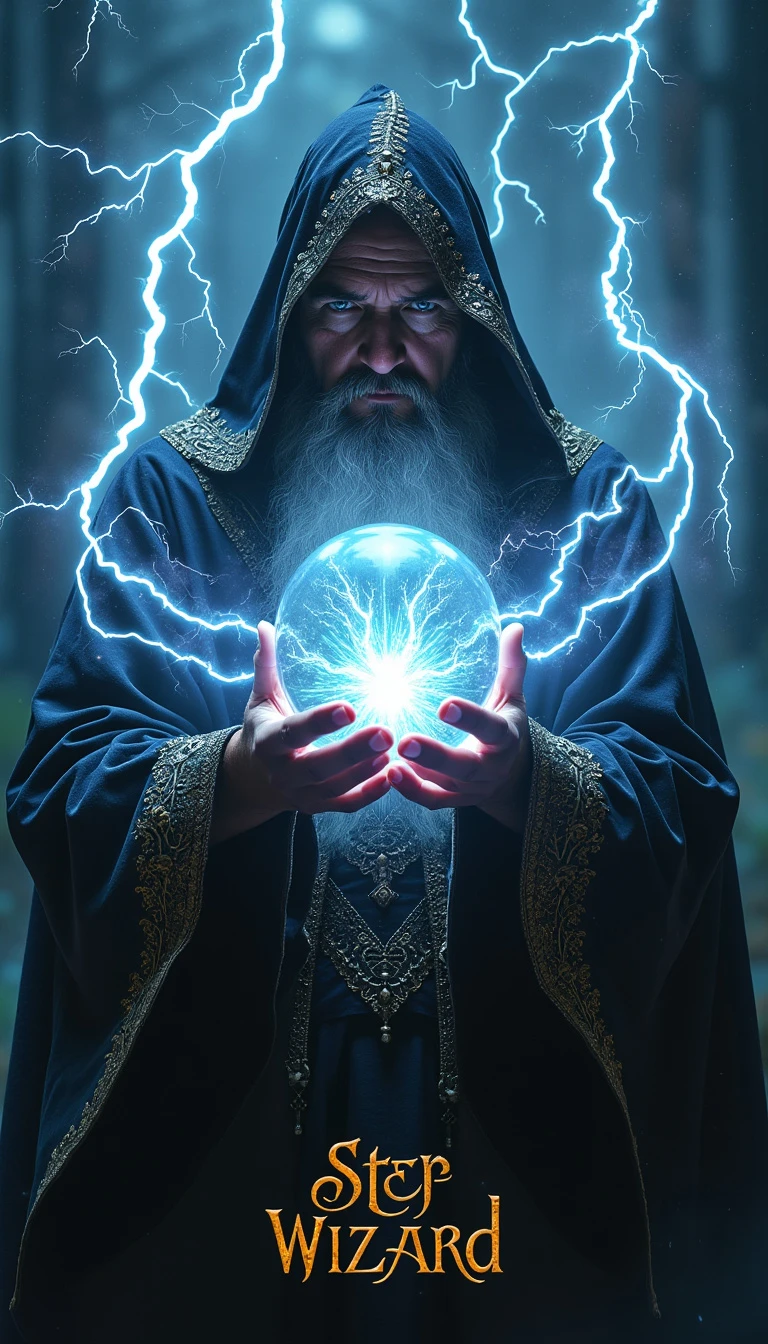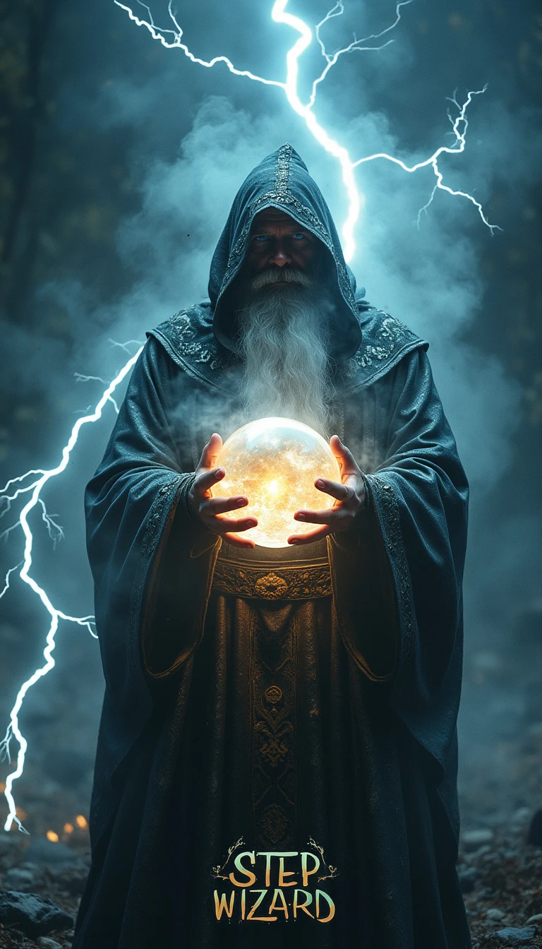 Create a striking image of a wizard shrouded in mystery and power. The wizard should be centered in the image, looking imposing, wearing dark, intricately detailed robes that glow with subtle hints of magical light. He holds a luminous crystal ball in his hands, and from this ball emanates an impressive electrical storm. Intense lightning and thunder disperse from the crystal ball, creating a dramatic and dynamic effect that spreads throughout the image. Around the wizard, the thunder should appear to intertwine and expand, enveloping the background of the image with a sense of chaotic and enchanting energy. The lighting should be intense, with the light from the lightning highlighting the wizard’s figure and creating dramatic shadows. In the bottom corner of the image, write the phrase “STEP WIZARD” in a stylized, magical font that complements the image’s theme and adds a final touch to the mysterious and powerful visual.