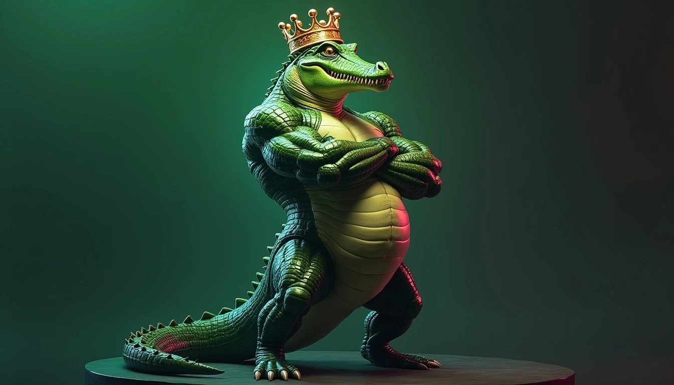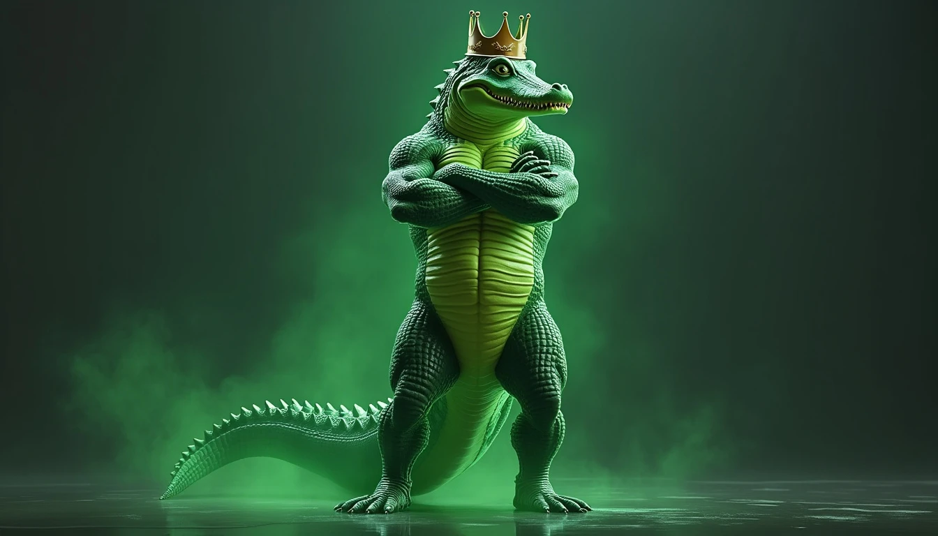 create an image prompt of a muscular human-shaped crocodile with a defined belly standing with arms crossed wearing a crown, the colors of the crocodile should be light green and dark green in neon effect, the image should be realistic