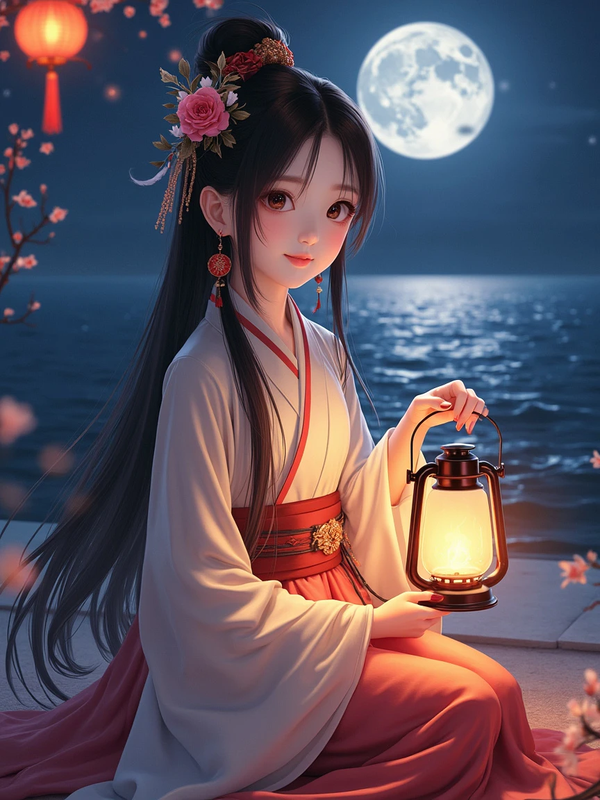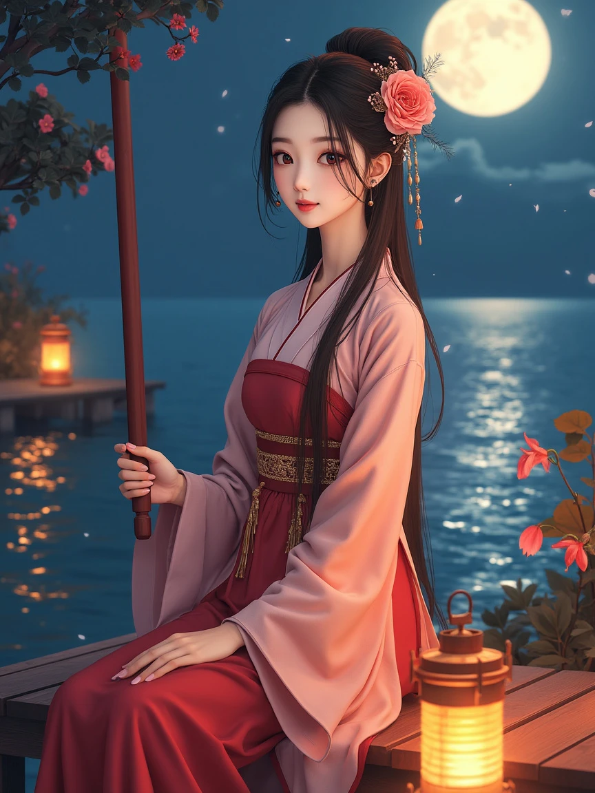 sdmai,best qality,high details, textured skin,Cold light, night, big moon,1girl wear hanfu,outdoor,flower,perfect face,lantern, Sea, (red Reef:1.2), Sit,(cowboy shot:1.3),Normal facial features,ulzzang-6500, (pureerosface_v1:1.3).