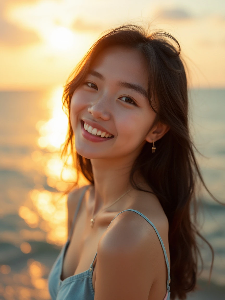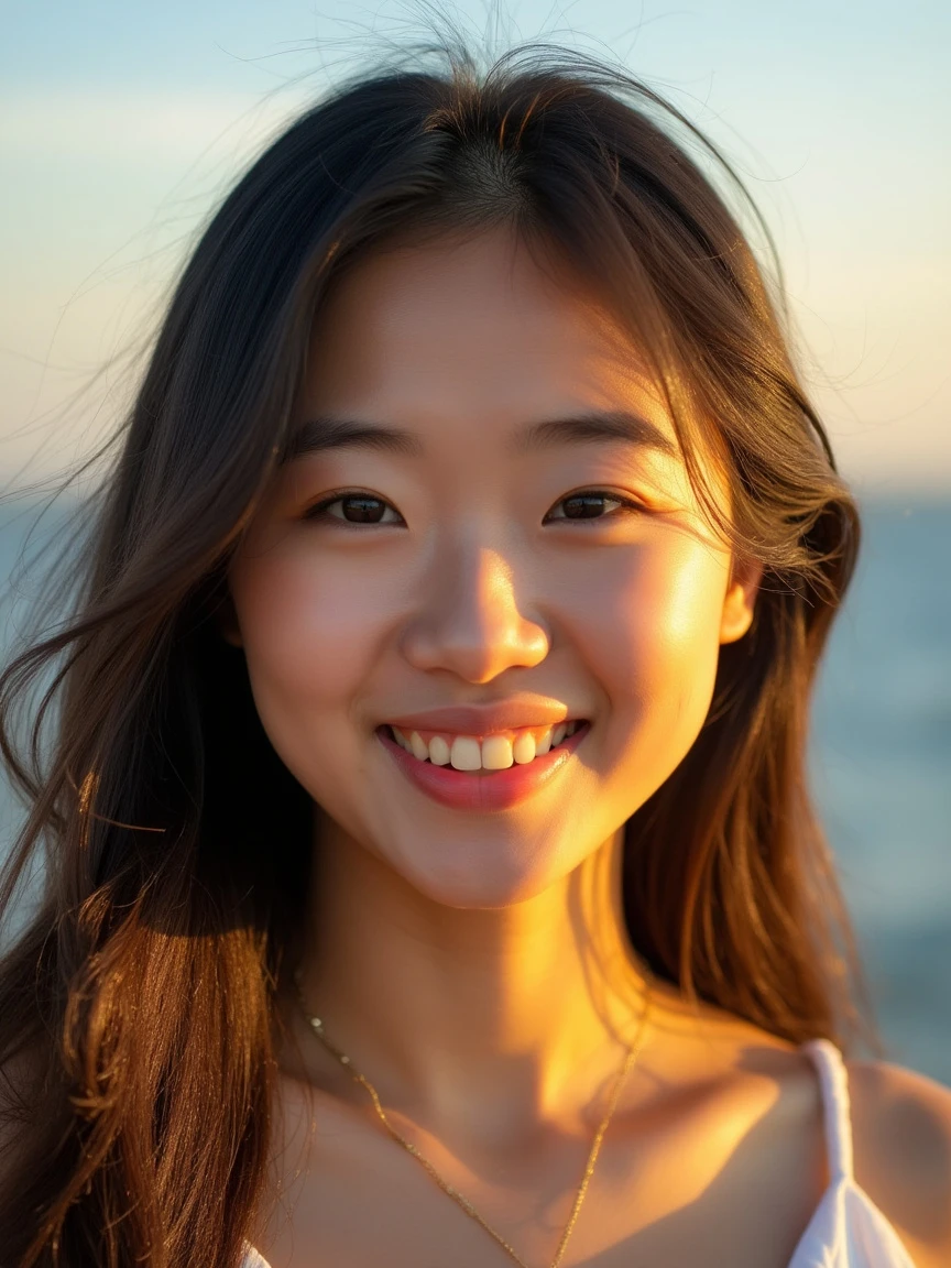 A Chinese girl, A Chinese girl, smiling in front of the camera, sunny, bright, beautiful, confident, with a positive perspective, natural light, upper body, natural scenery background, yellow and blue tones,smiling in front of the camera, sunset over sea, golden time