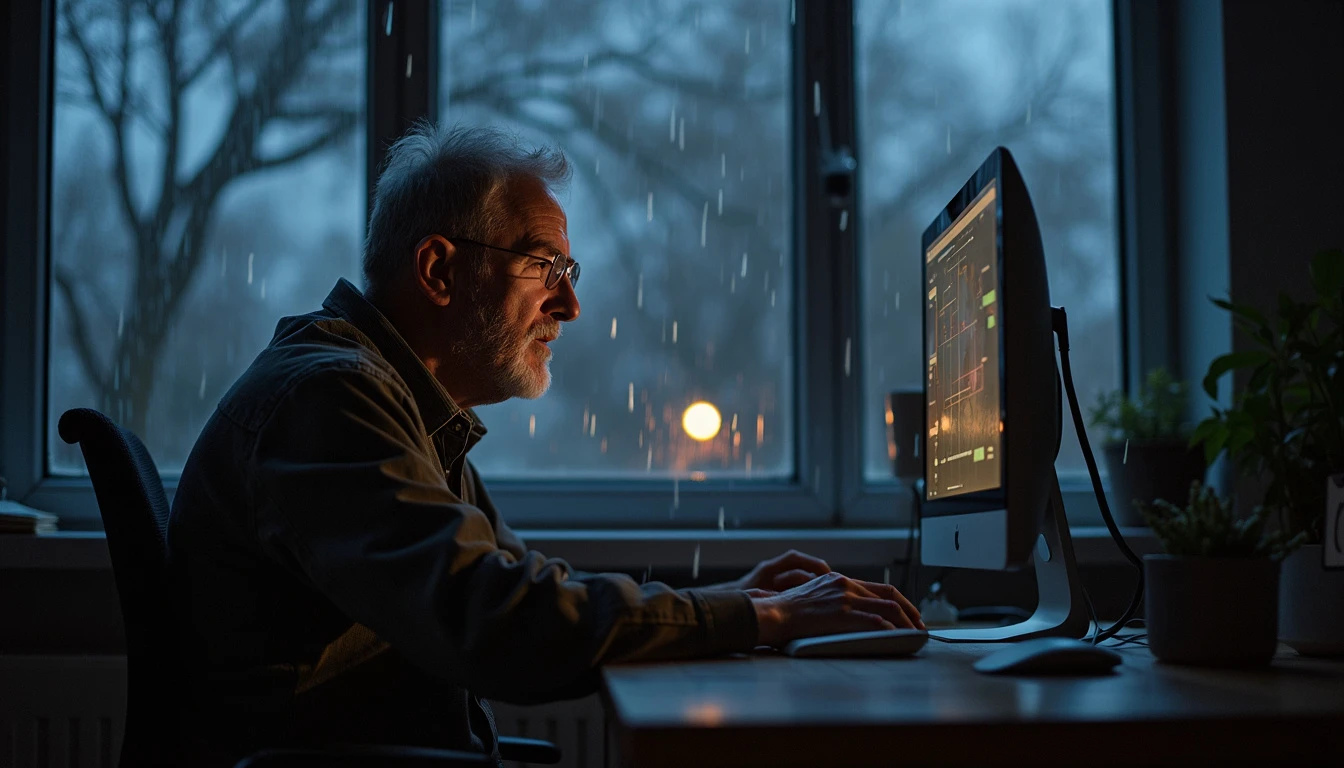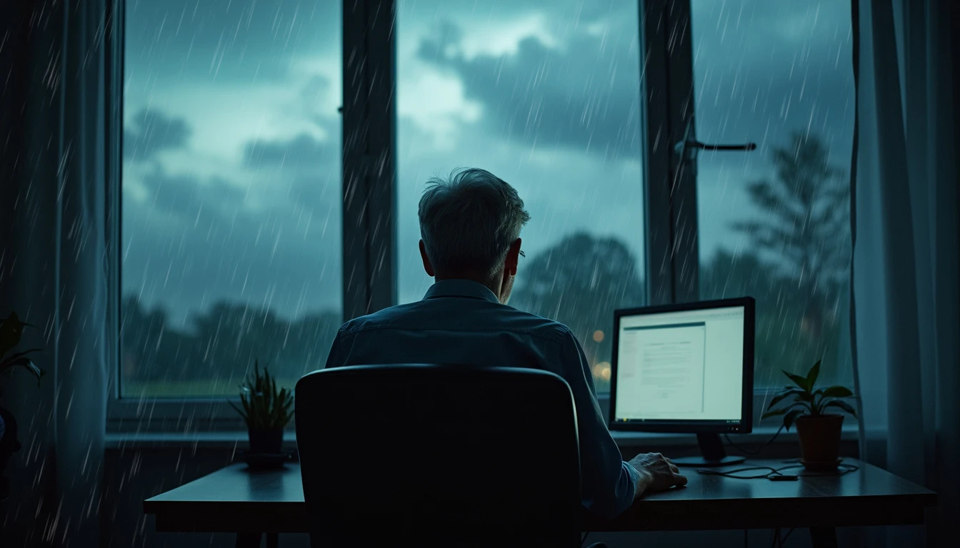 close up A 60-year-old man sits in total darkness in front of his computer, only slightly illuminated by the light from the monitor. Behind him, a large window reveals a stormy night sky and heavy rain falling.