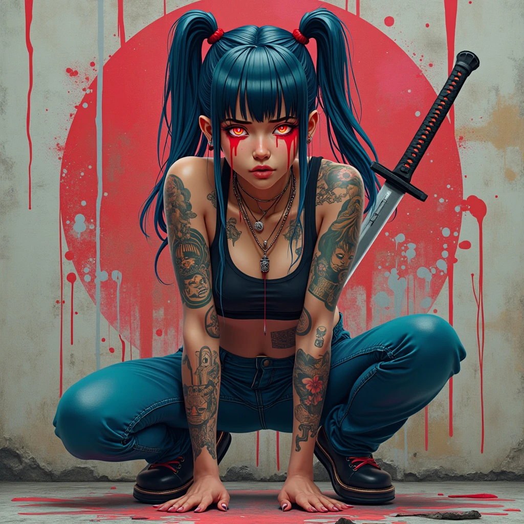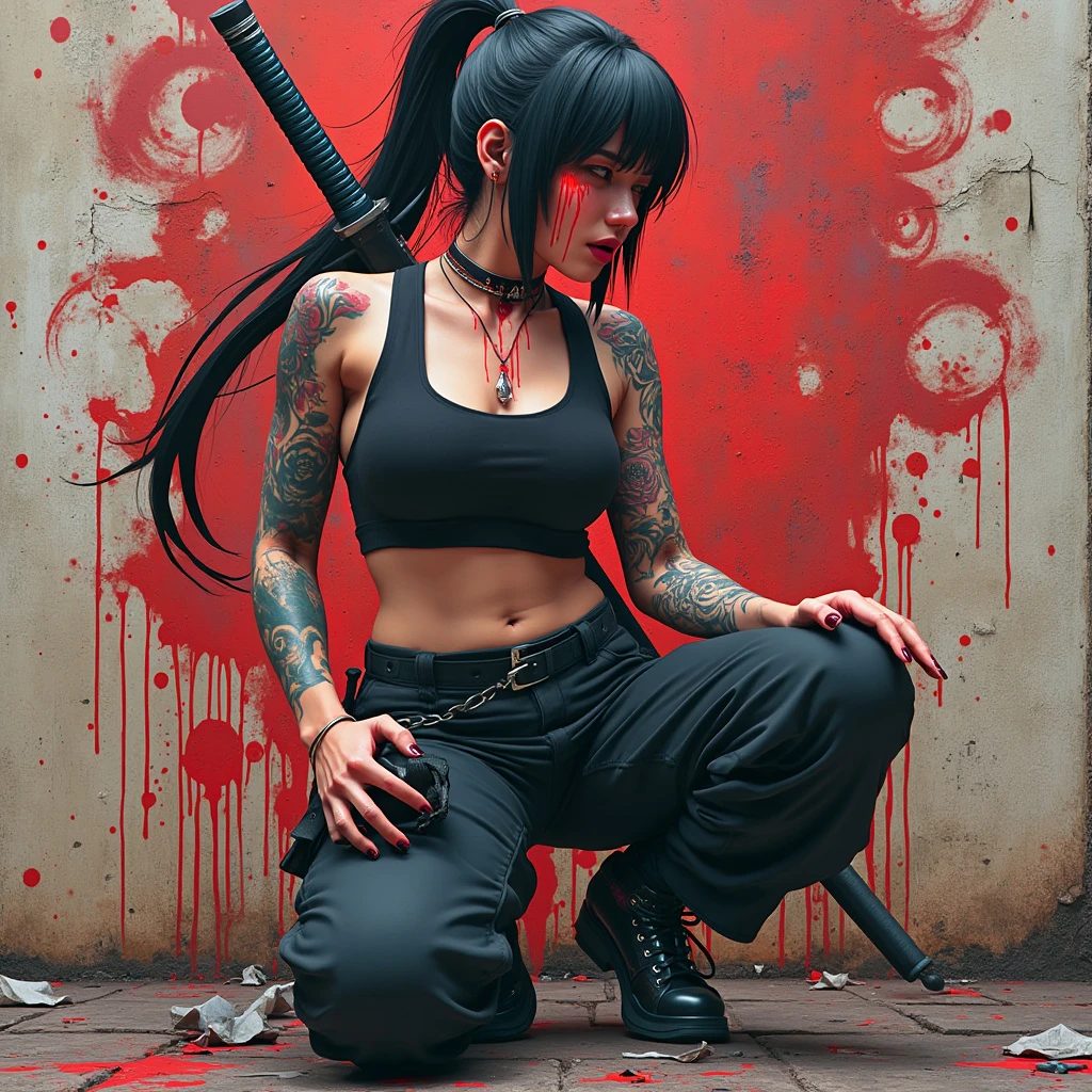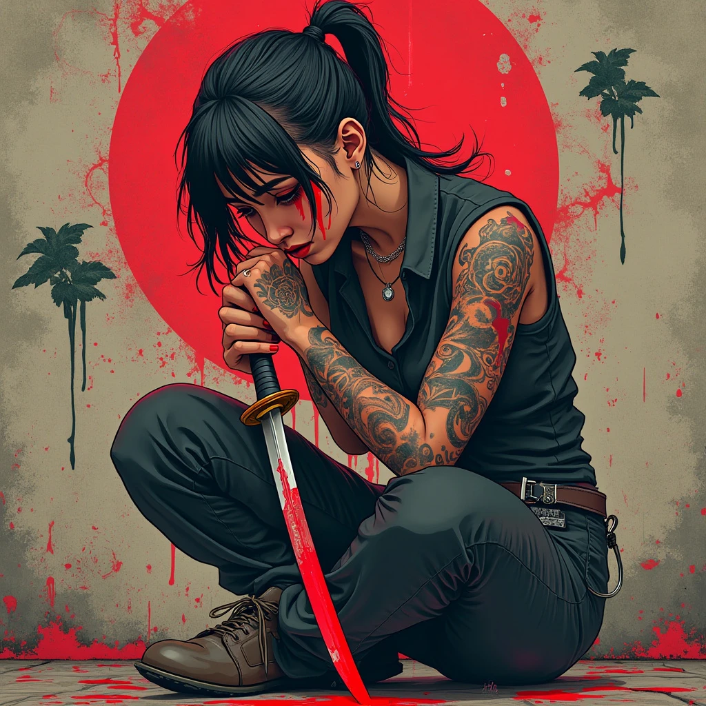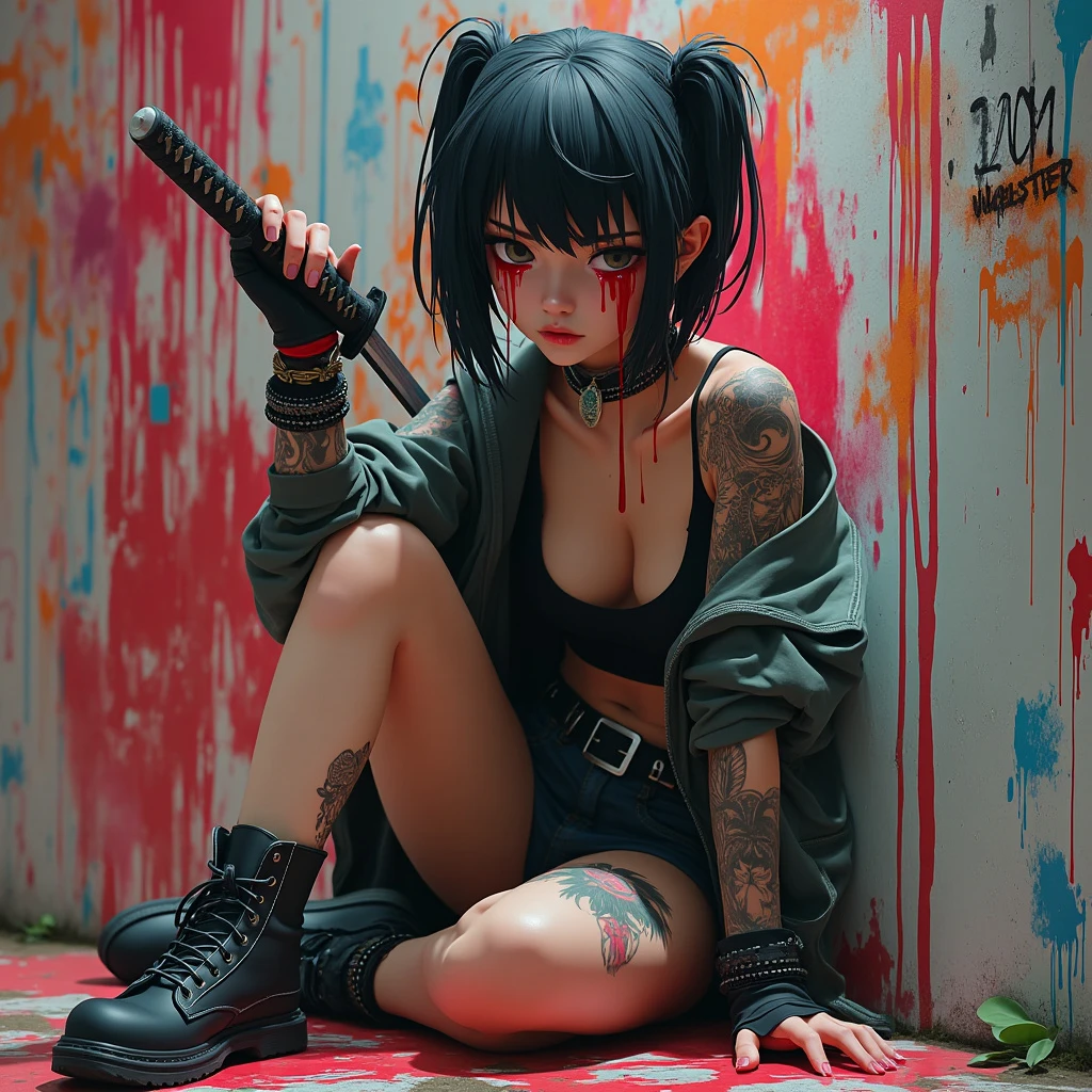 "Young woman crying red tears coming down her face, her tattoos on her arm, holding a katana for balance, Kneeling down on a knee, Behind her, Her clothes are modern streetwear, Cosmic colors blends with graffiti. Style: Ghost in the Shell meets Max Payne." insanely detailed 3-D, Graffiti and inspired by cornbread,