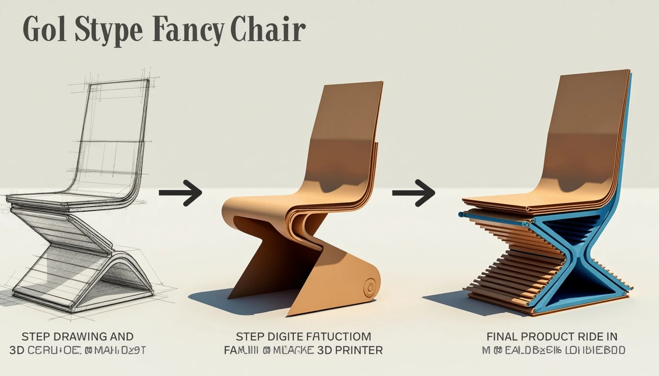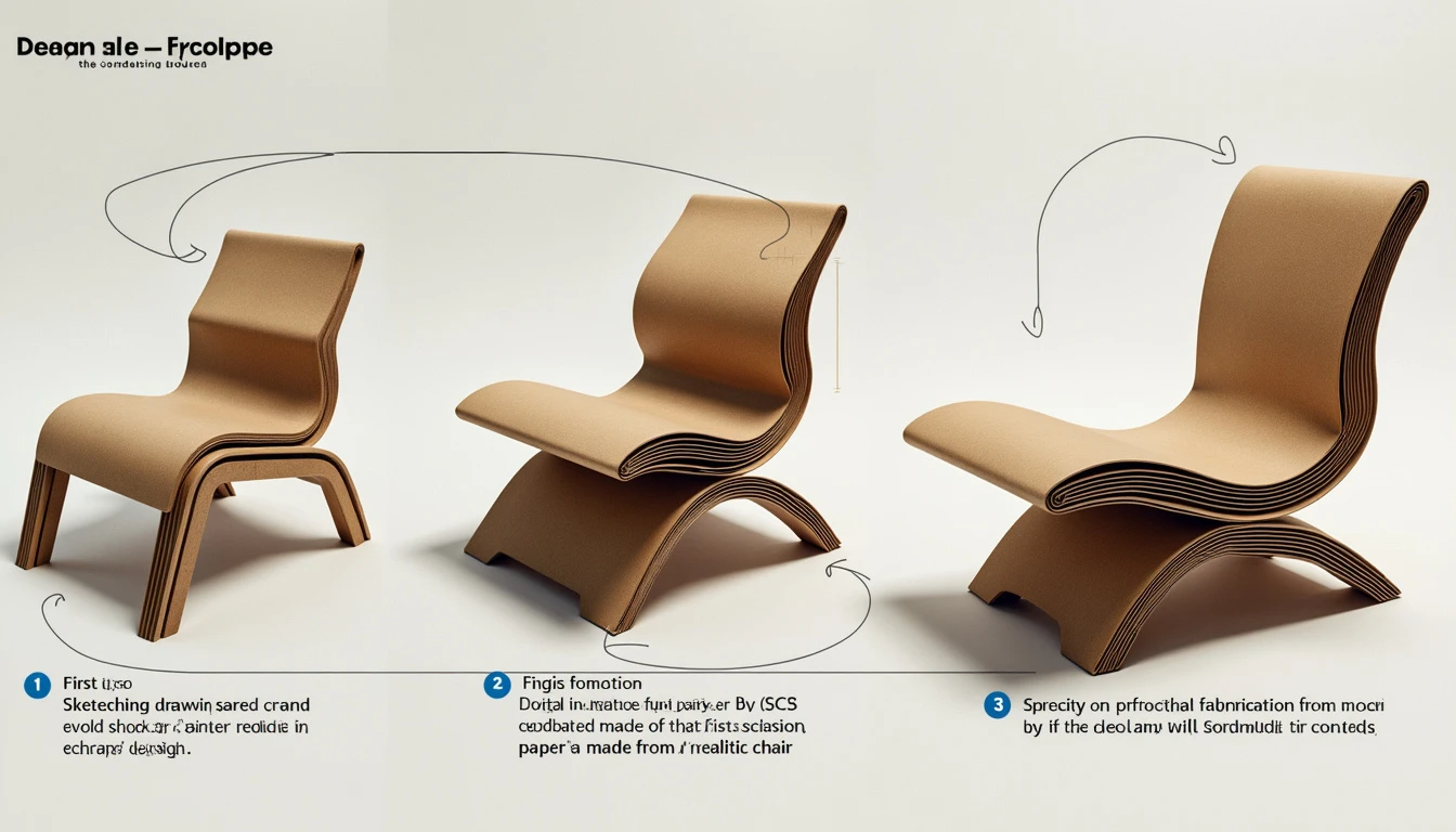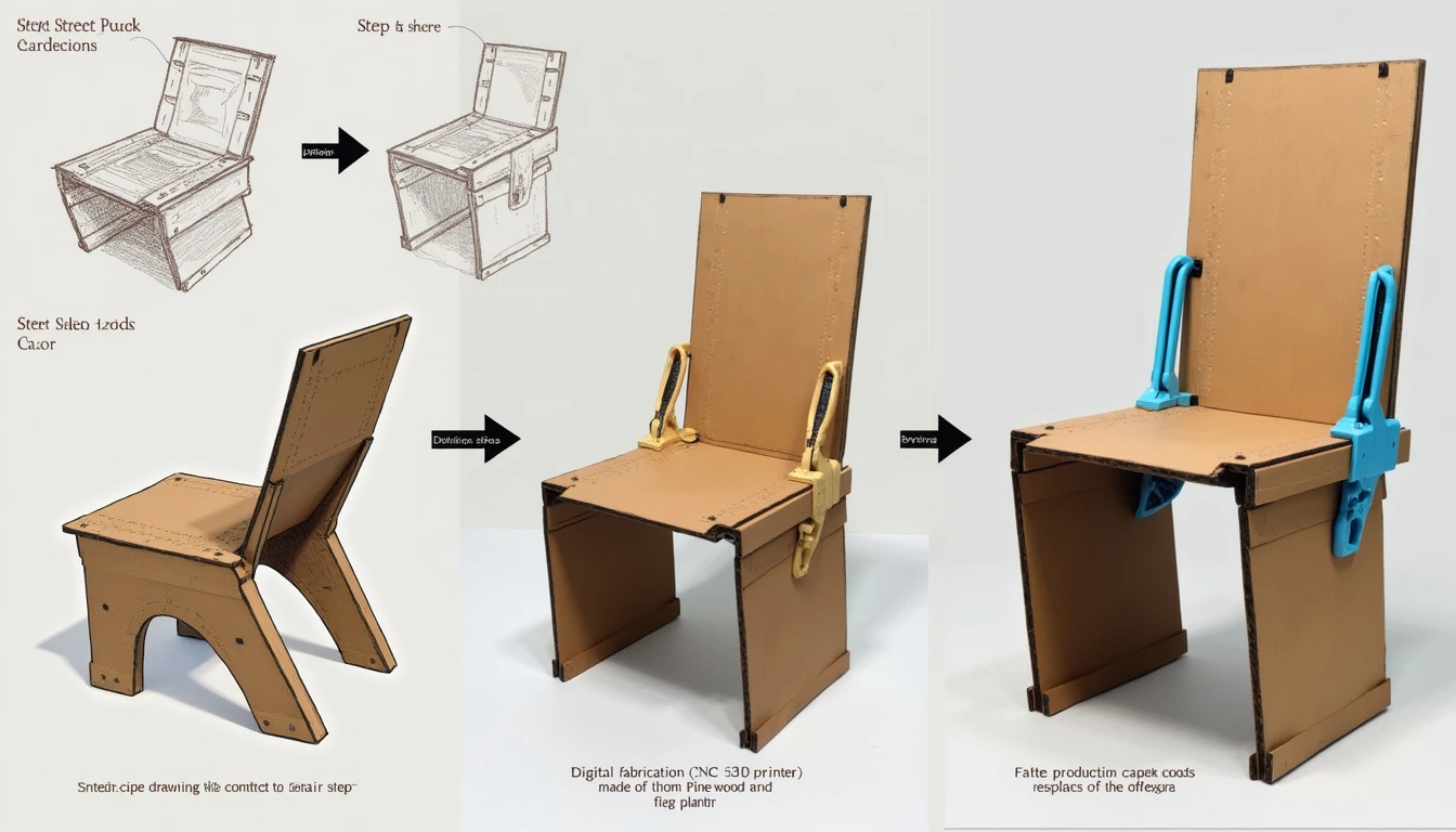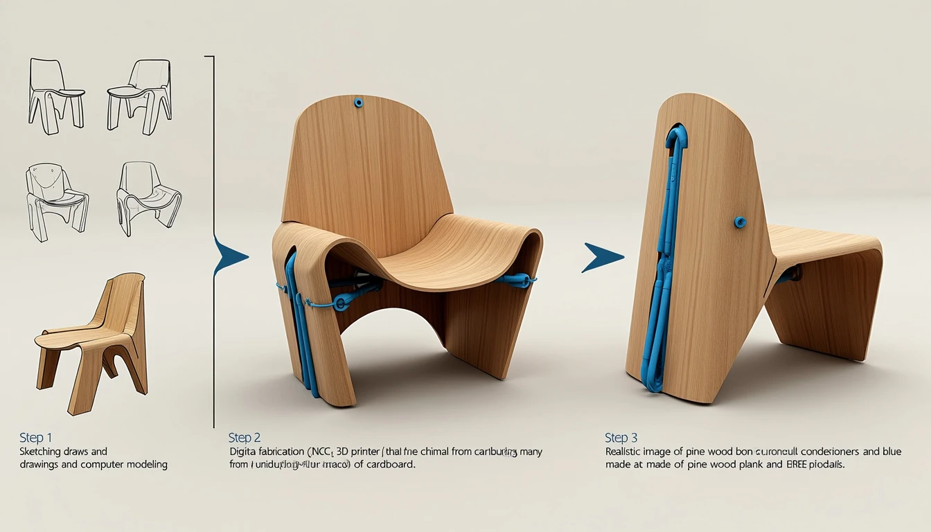 a diagram showing steps of prototype contemporary fancy chair design, first step sketching drwaings and 3D computer modeling, second step is a realistic image of digital fabrication (CNC and 3d printer) from the same chair made of brown paper cardboard, third step is a realistic image of final product chair made of pine wood plank and blue plastic conections