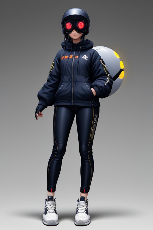 A highly detailed CGI rendering of a cute, small anthropomorphic, futuristic robot character. The robot stands in a three-quarter view against a dark, gradient background that transitions from black to a deep navy blue. The robot's head is spherical with glowing, neon yellow eyes that give it a futuristic, otherworldly appearance. The head is encased in a sleek, black helmet with a visor that partially covers the eyes, and the word "Adidas" is printed in yellow in one side of the helmet. The robot's body is clad in a bulky, black, puffy jacket with a high collar, zipped up to the neck, and a small, embroidered yellow Adidas logo on the left chest. The jacket has a quilted texture with visible seams and a zipper that runs down the front. The robot's hands are large and gloved, with thick, padded fingers and palms, indicating a robust, protective design. It wears black pants with a similar padded texture. The robot's feet feature futuristic, yellow neon sneakers with a small touch of yellow neon lines. The overall aesthetic is a blend of cyberpunk and high-tech fashion