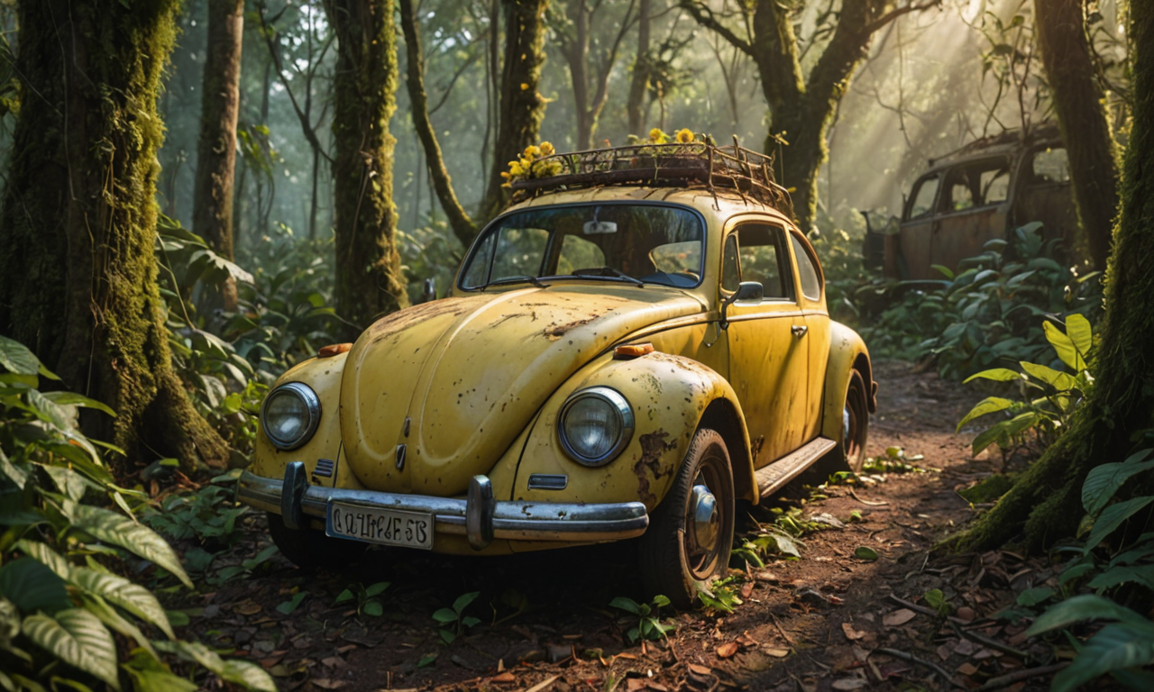 old rusted and broken down yellow volkswagen beetle on a thick amazon forest with vines hanging from the trees, with flowers scattered across the ground, photorealistic, 8k quality, dramatic lighting, sunlight shining through the trees