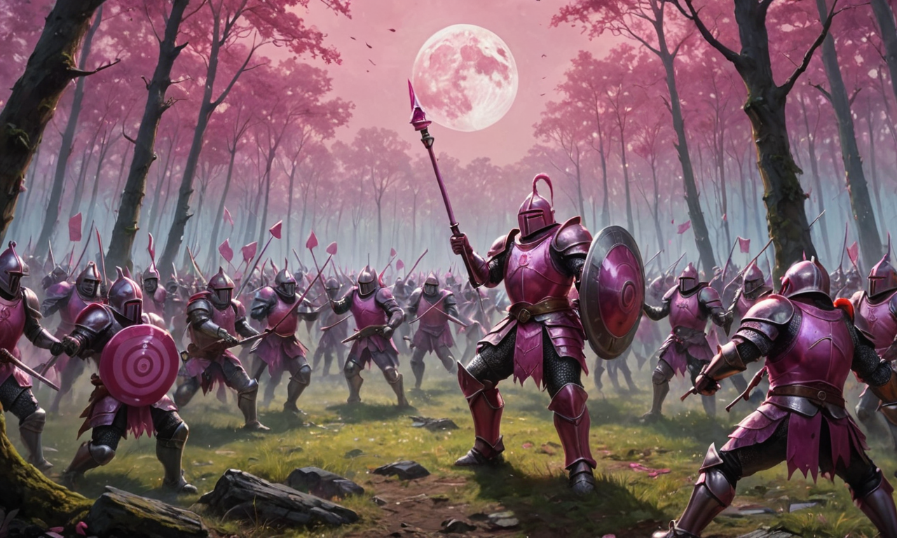 a fantasy oil painting capturing a group of knights in shining pink armor, wearing lollipop insignia, (going on epic war against a group of orcs), in a magical and fantasy forest, a big moon in the shape of a swirling lollipop shining in the background, battlefield, dynamic shot, action packed pose, depth of field, dramatic lighting, fog