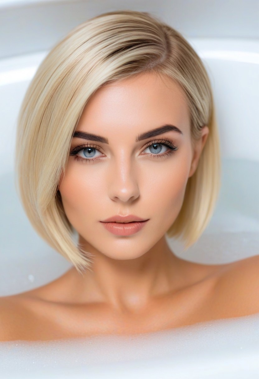 seductive beauty ,upper body photo, inverted bob haircut, straight blonde hair, german, beautiful face, looking at viewer, erotic photoshoot, bubble bath