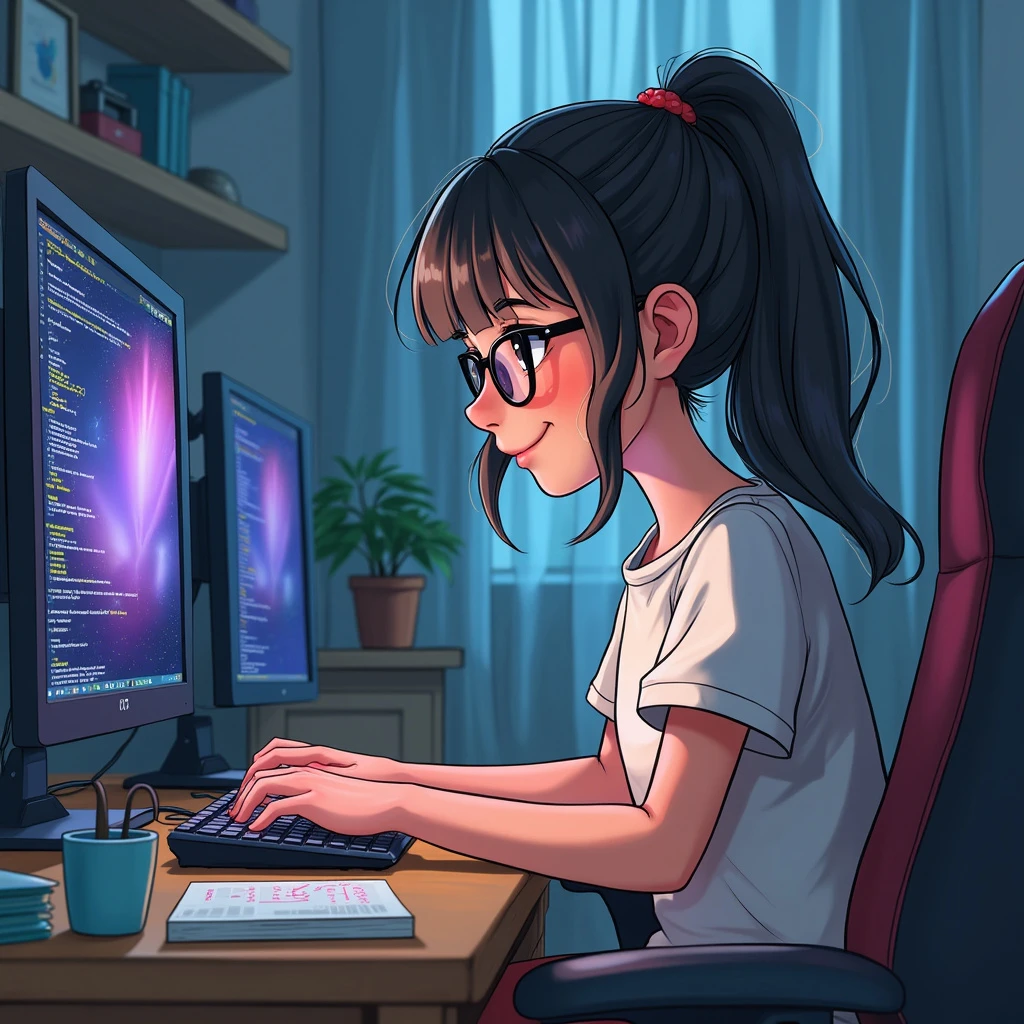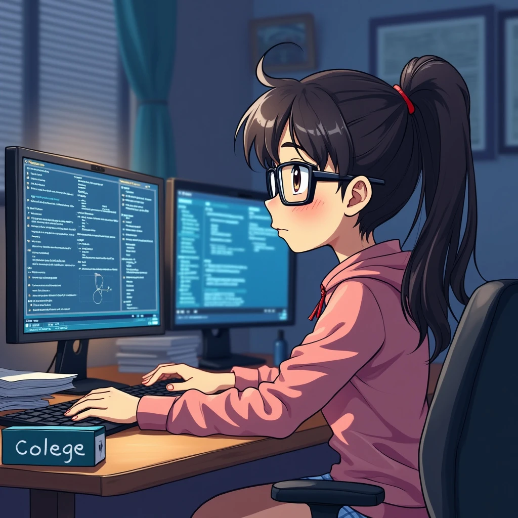 A young primary student, girl, hacking on a computer with multiple screens. She looks smart and has glasses. Next to here she has a college block with formulas written on it. Realistic fotography.
