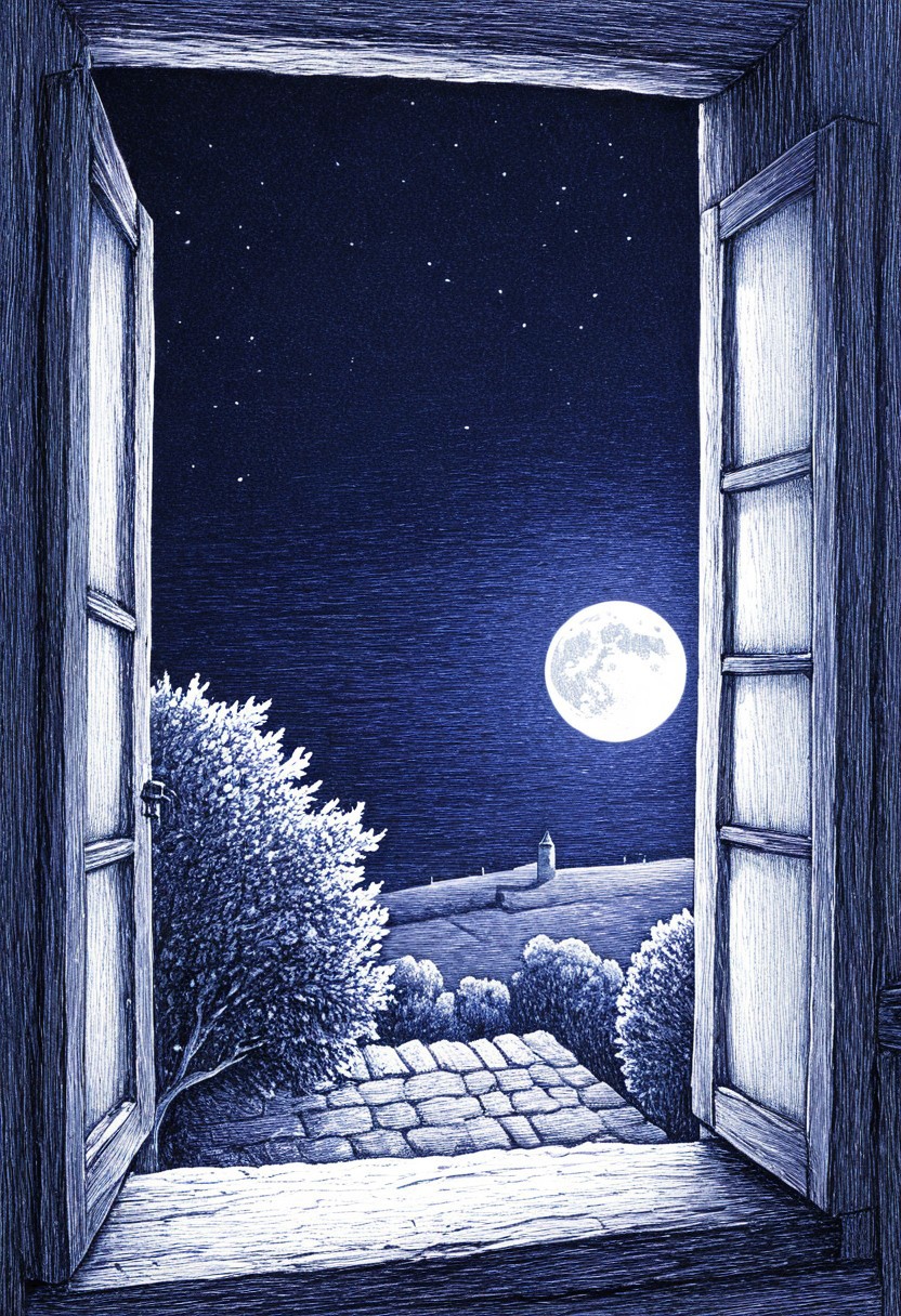 novuschroma42 style, ballpoint pen drawing, lineart, monochrome, skanzen, BREAK, moon, night, sky is cracking open, village, lantern on a windowsill