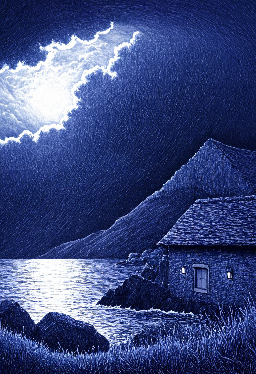 novuschroma42 style ballpoint pen drawing, lineart, monochrome, skanzen, BREAK, storm, village, sea, stormclouds, storm, lightning
