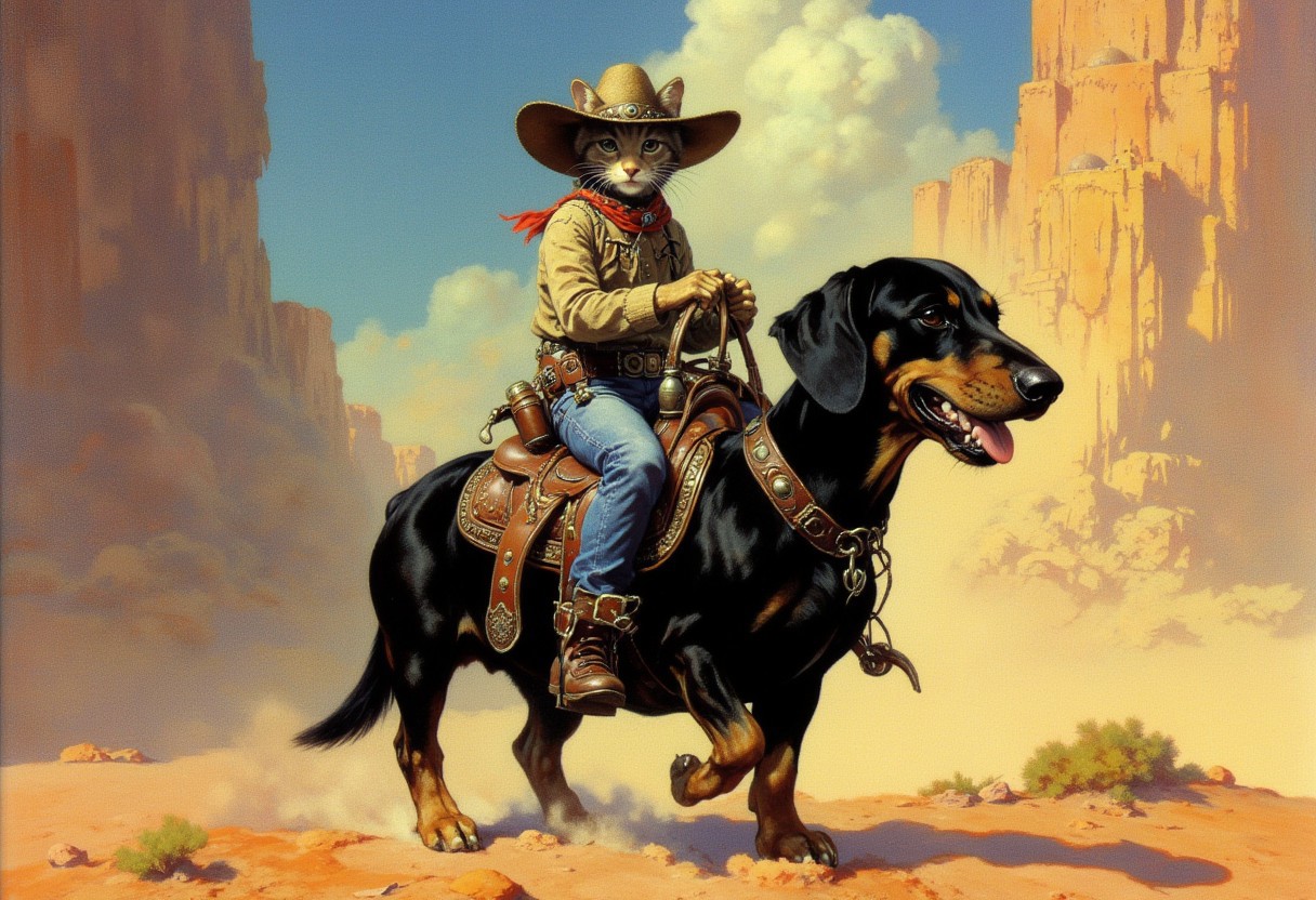 Frank Frazetta sci-fi oil painting of just a happy all black Dachshund wearing a small saddle with a cat wearing a cowboy hat dressed like a cowboy riding on his back, a classic gothic baroque fantasy art painting with vibrant colors, digital artwork, illustrative, matte painting, highly detailed, highly dramatic lighting