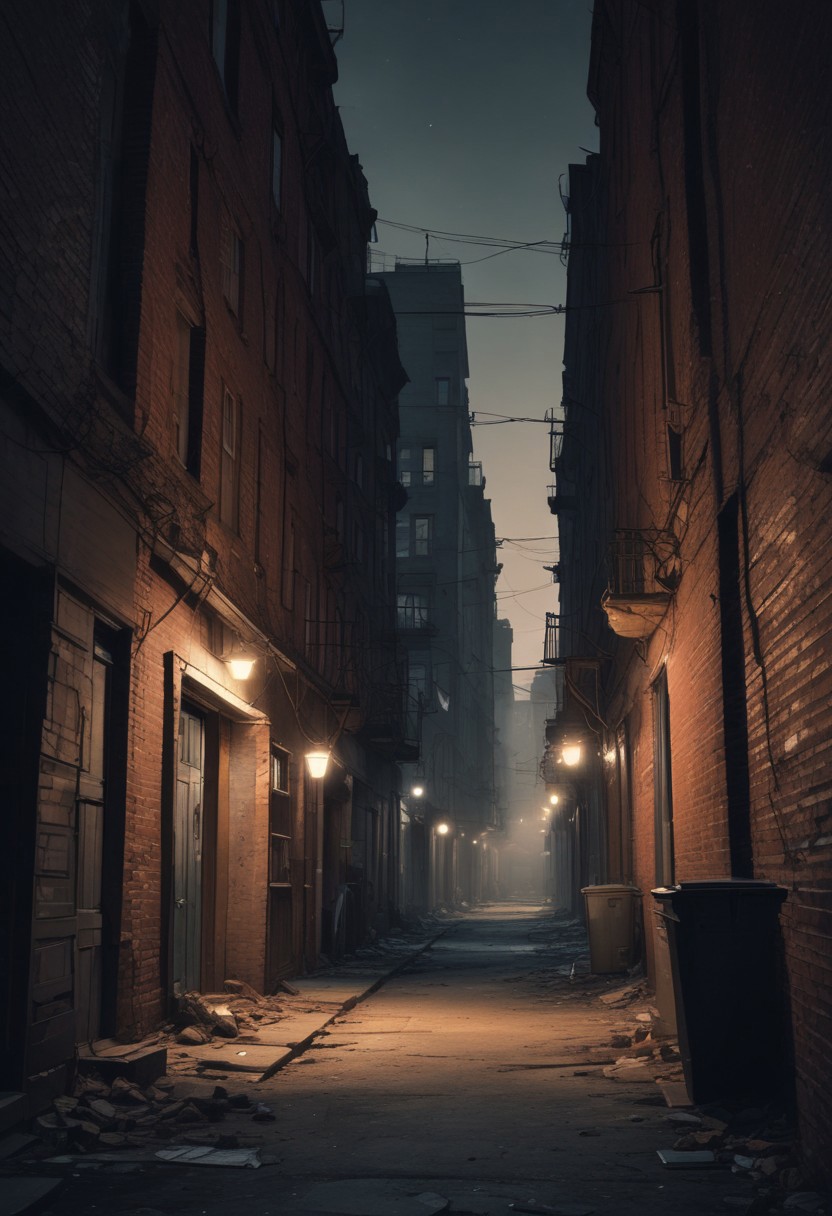 A dimly lit 2D alley at night, with tall, shadowy buildings on either side. The only light comes from a flickering streetlamp casting long, dark shadows on the cracked pavement. Trash cans and debris line the alley, adding to the eerie atmosphere