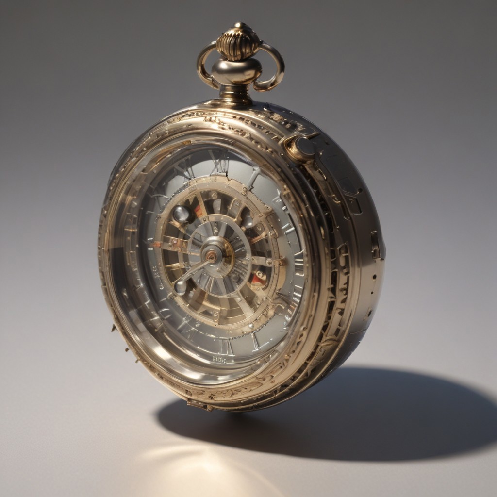 Futuristic communicator disguised as an antique pocket watch, lying on a table, projecting a hologram above it, science fiction, technology,